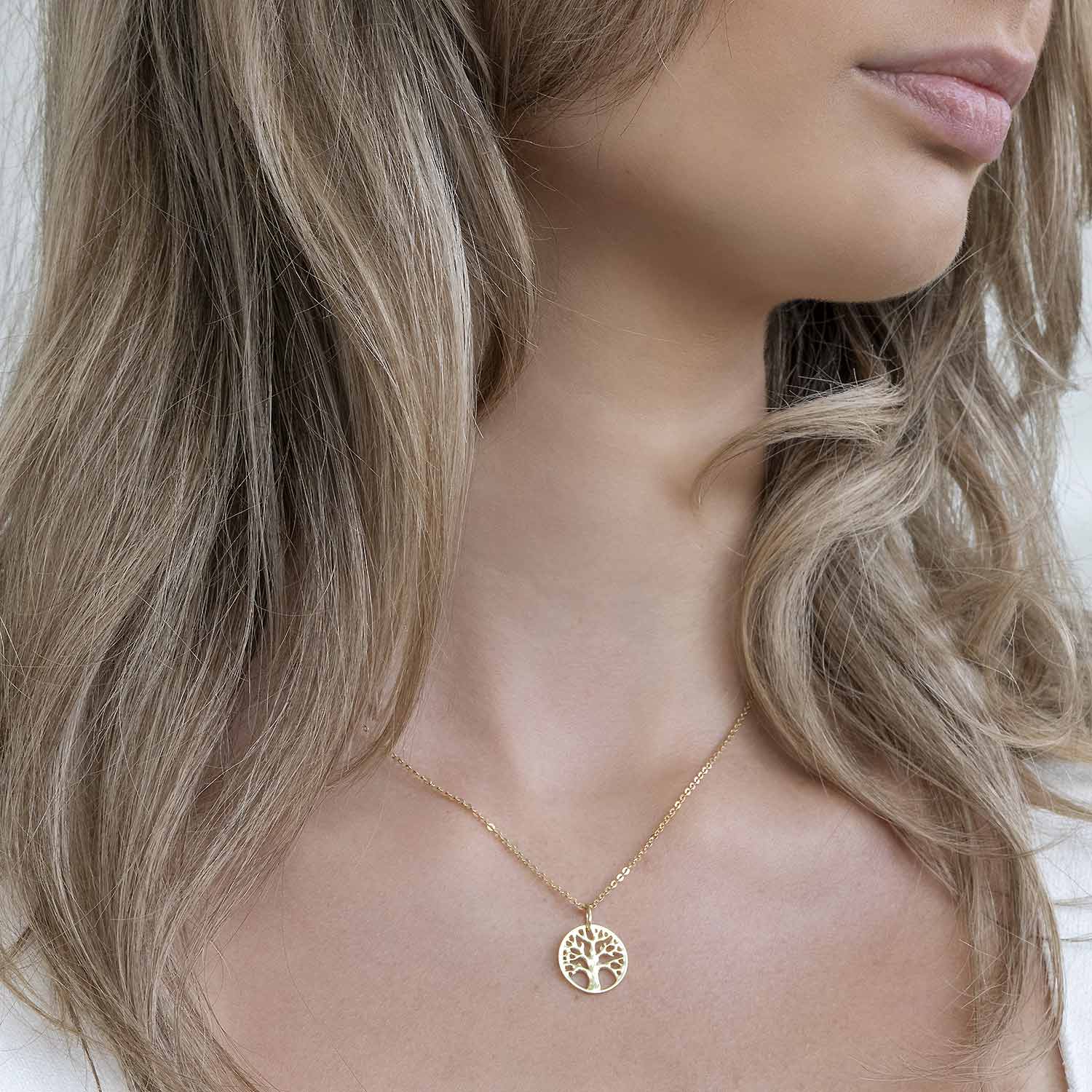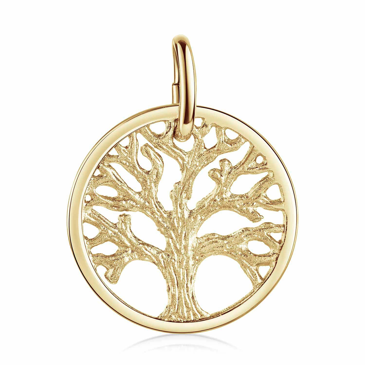 Goldener Kettenanhänger mit detailliertem Lebensbaum Motiv aus vergoldetem 925 Sterling Silber - Wahlweise mit Ankerkette bestellbar.