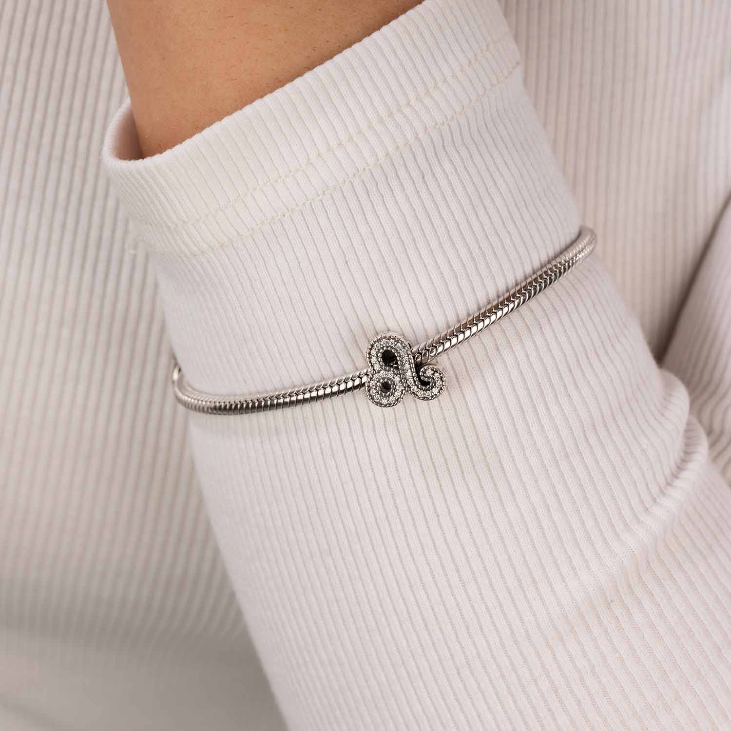 Funkelnder Charm mit dem Sternzeichen Löwe aus 925 Sterling Silber. Der Bead ist mit zahlreichen weißen Zirkonia verziert und eignet sich für alle Beads Armbänder und Ketten bis 4,4mm Stärke.