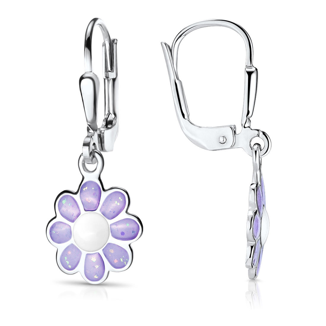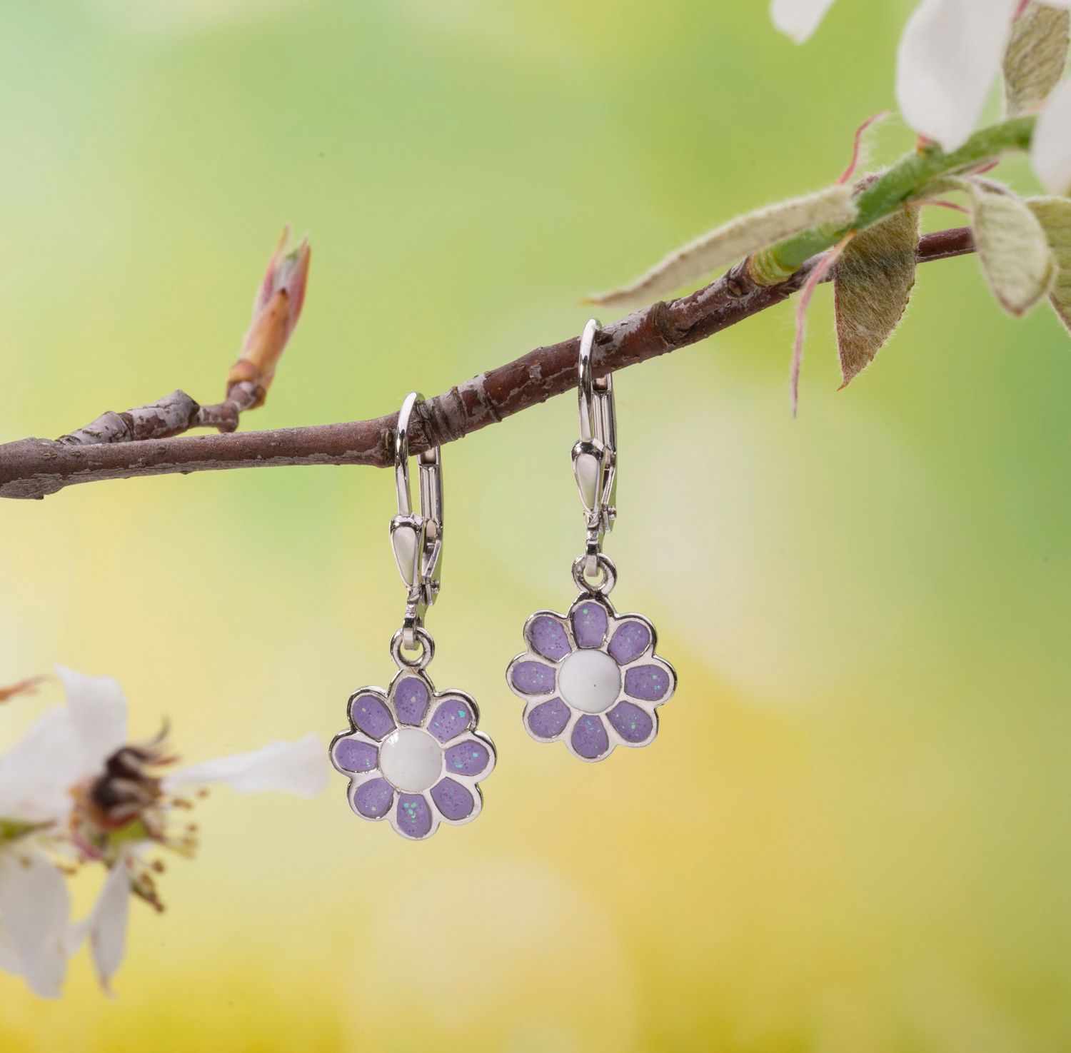 Niedliche Blumen Ohrhänger für Kinder mit lilafarbener und weißer Emaille-Verzierung, leicht glitzernd. Durch die hochwertige Fertigung aus hautfreundlichem 925 Sterling Silber sind die Ohrstecker ideal für empfindliche Kinderohren.