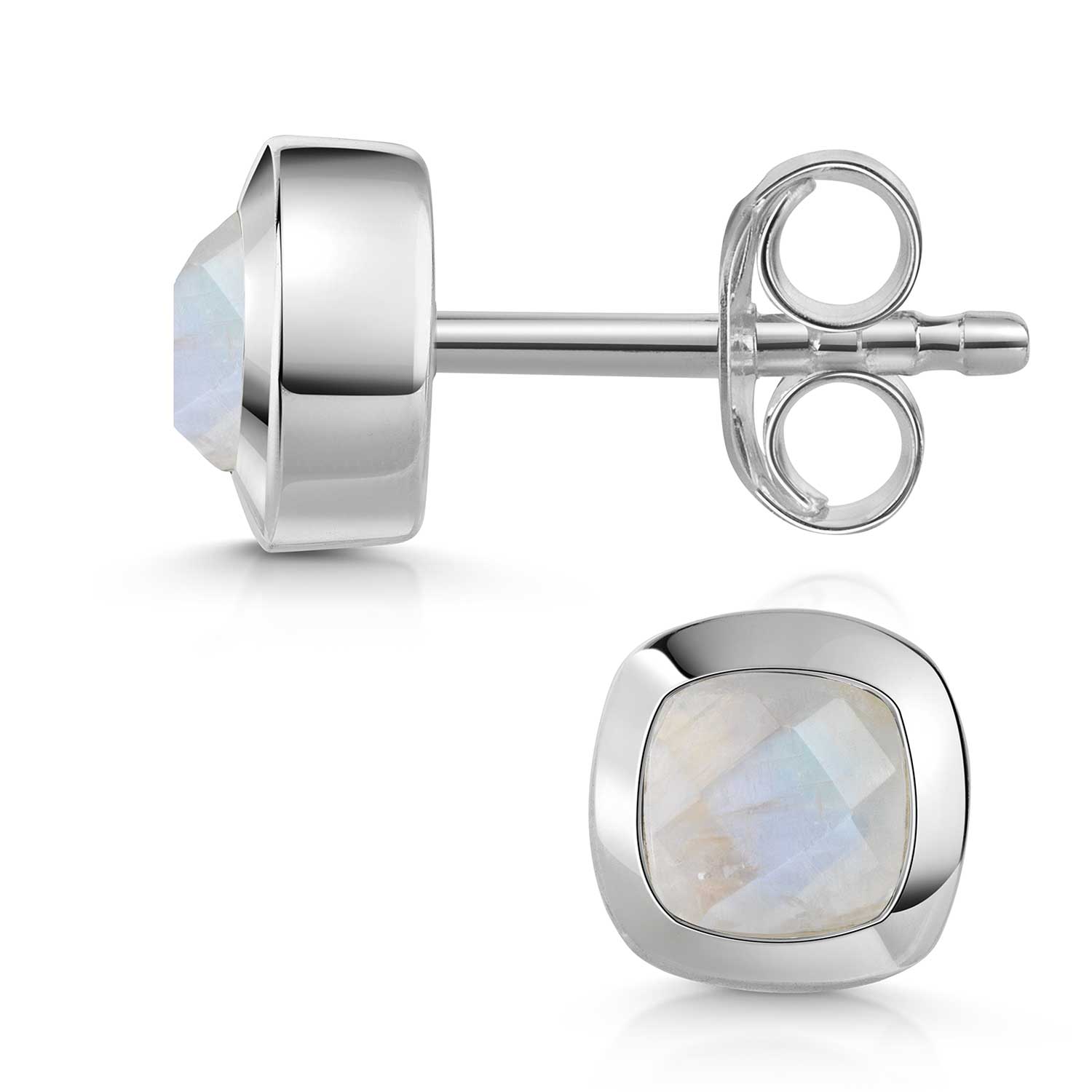 Quadratische Damen Ohrstecker mit echten Mondstein Edelsteinen aus rhodiniertem 925 Sterling Silber.