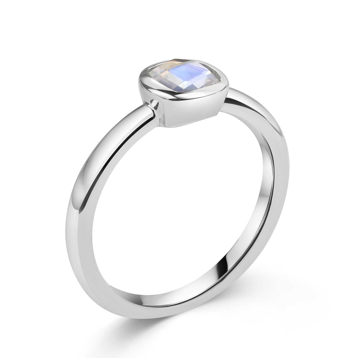 Quadratischer Damenring aus 925 Sterling Silber mit einem weißem Mondstein in facettiertem Schliff.