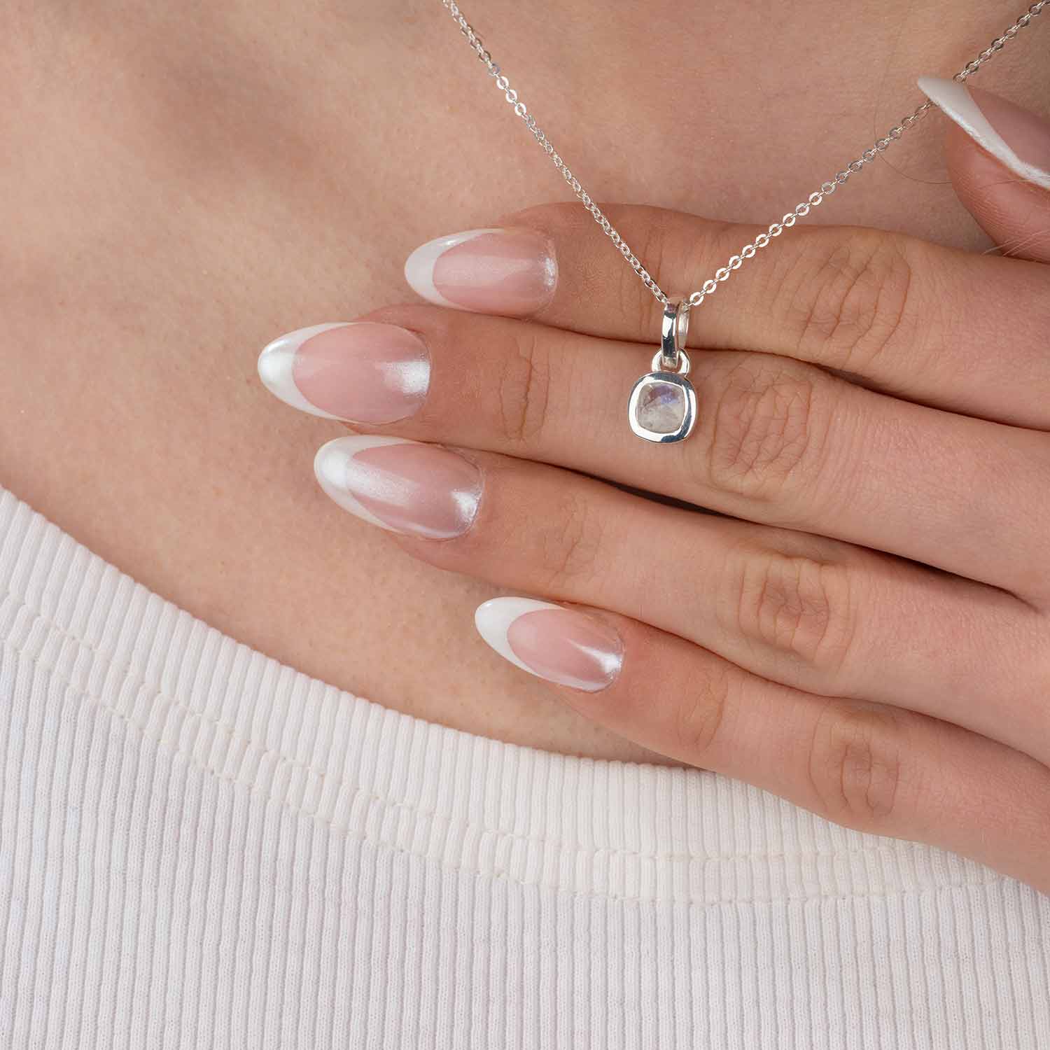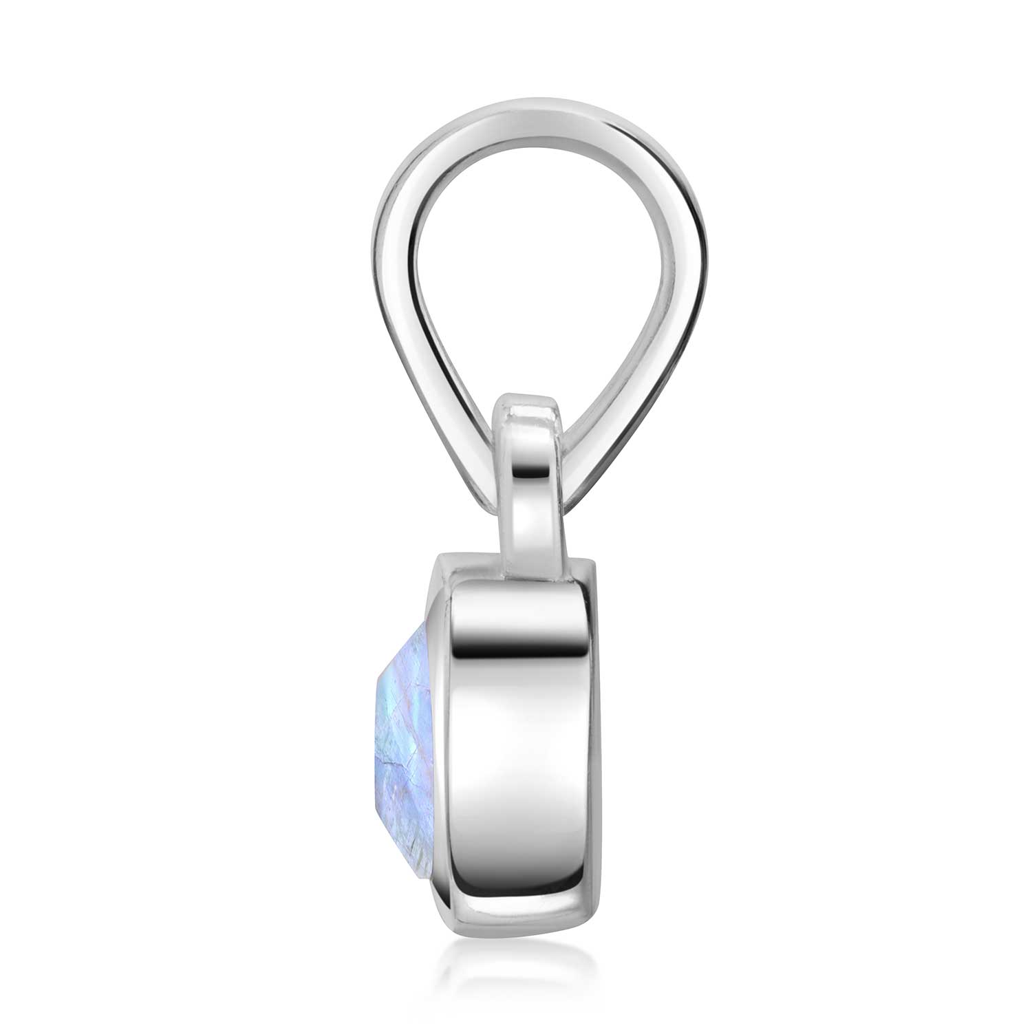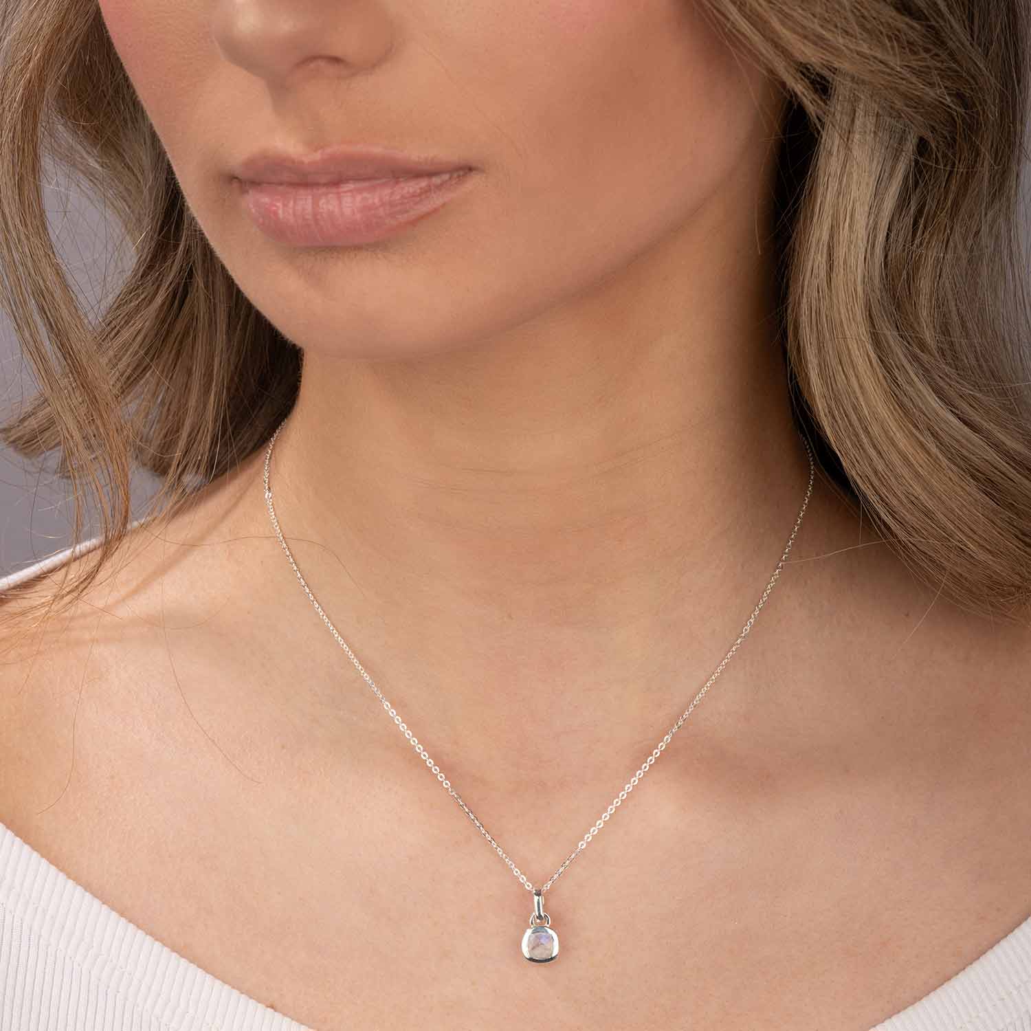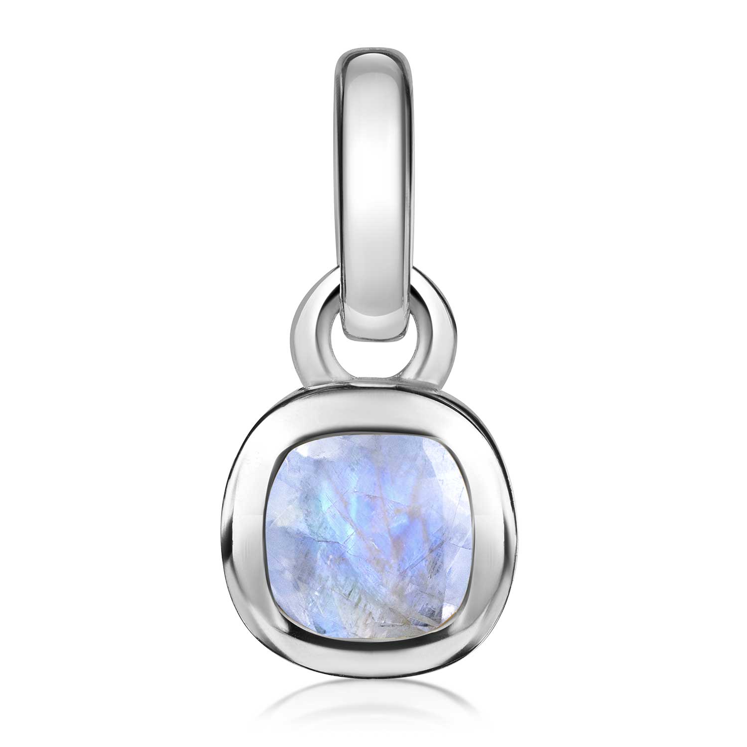 Quadratischer Kettenanhänger aus 925 Sterling Silber mit einem facettierten Mondstein. Wahlweise mit einer passenden Ankerkette erhältlich.