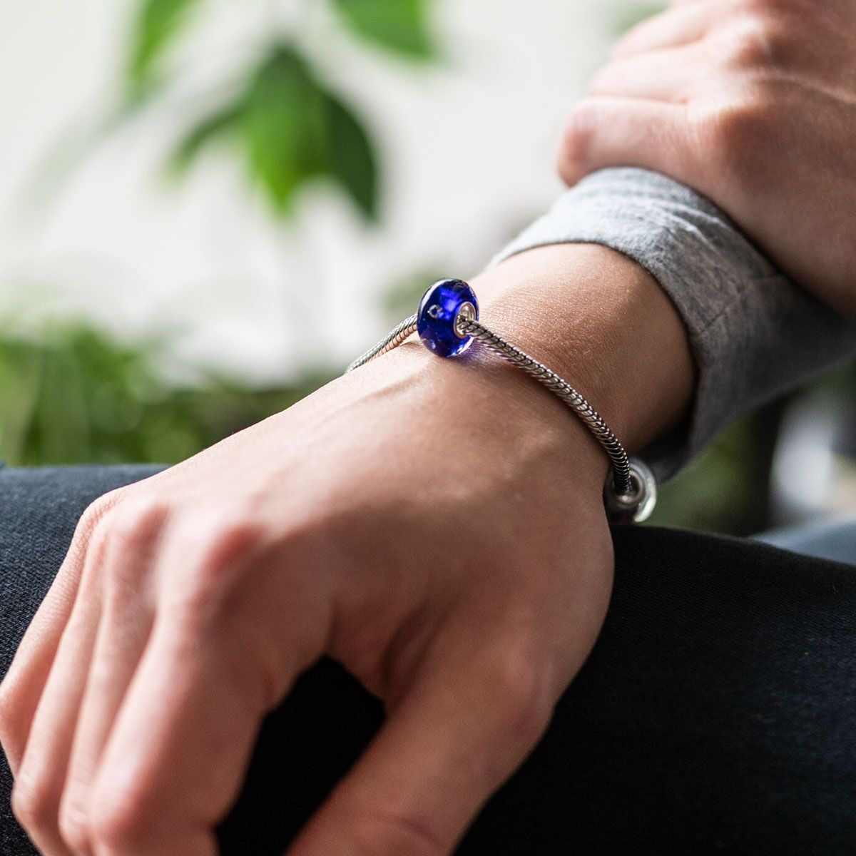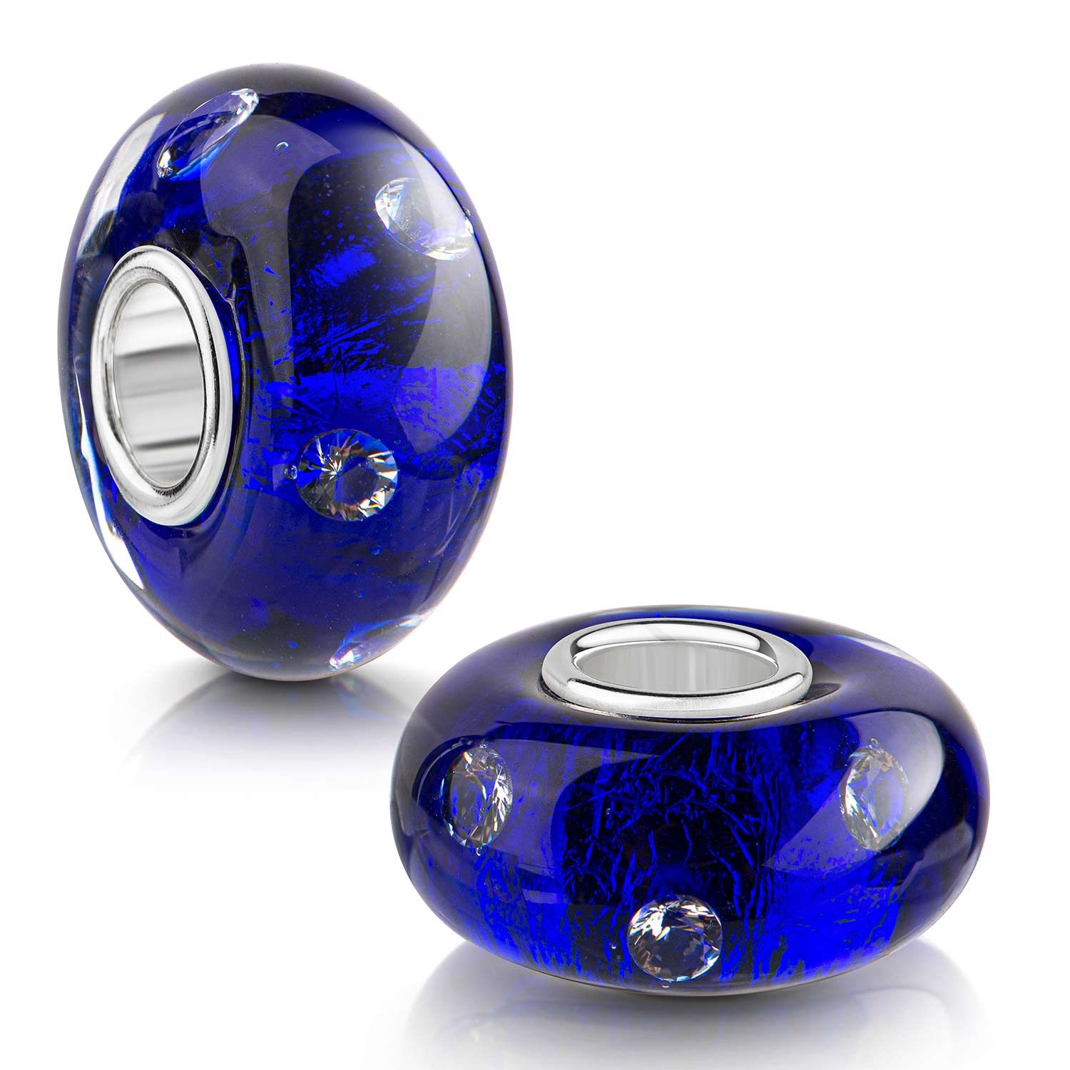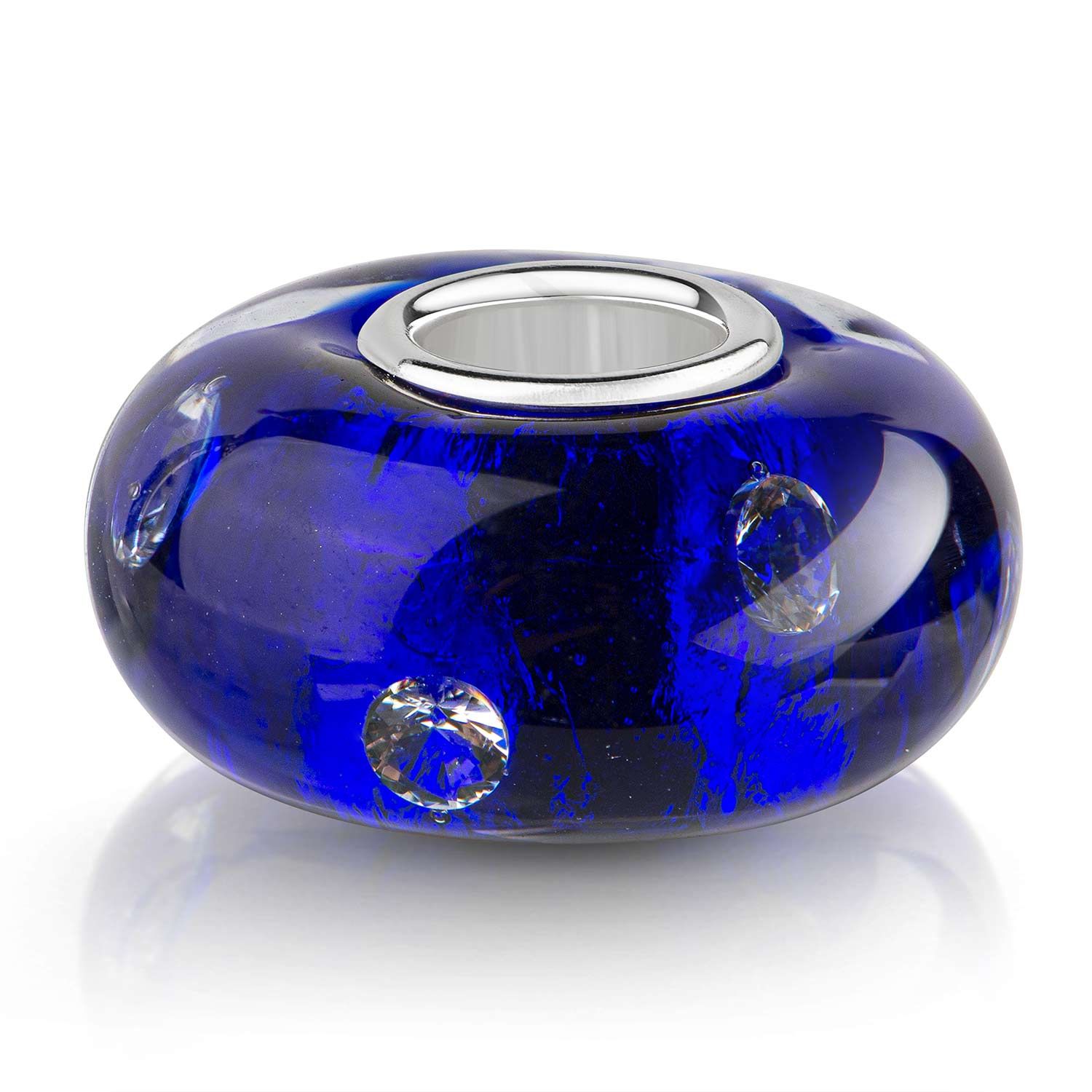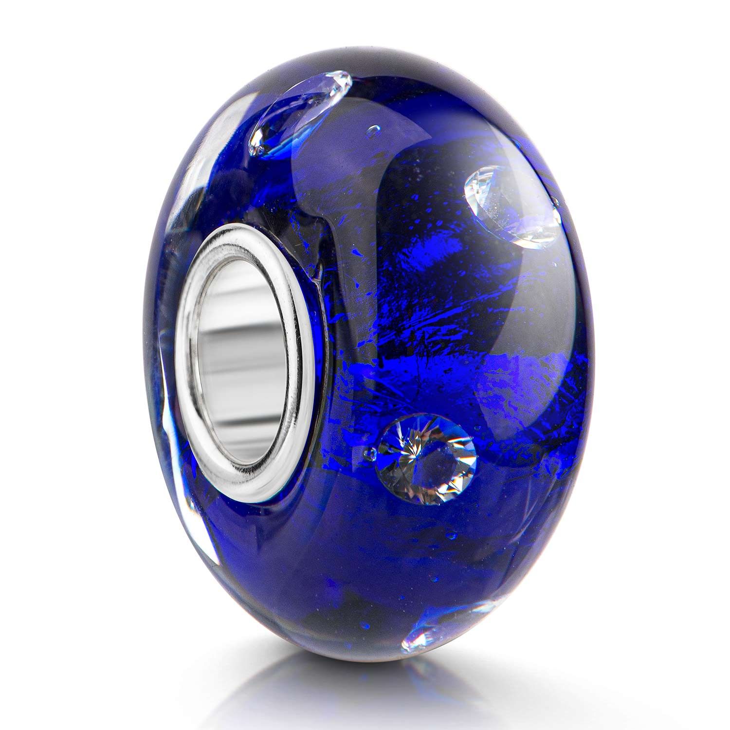 Dieser dunkelblaue Glas Bead wird Sie durch die 7 eingearbeiteten Zirkonia Steine begeistern. Dieser Bead ist passend zu allen gängigen Beads Armbändern und Ketten bis max. 4,4mm Breite/ Durchmesser und ist daher für alle Marken Beads geeignet.