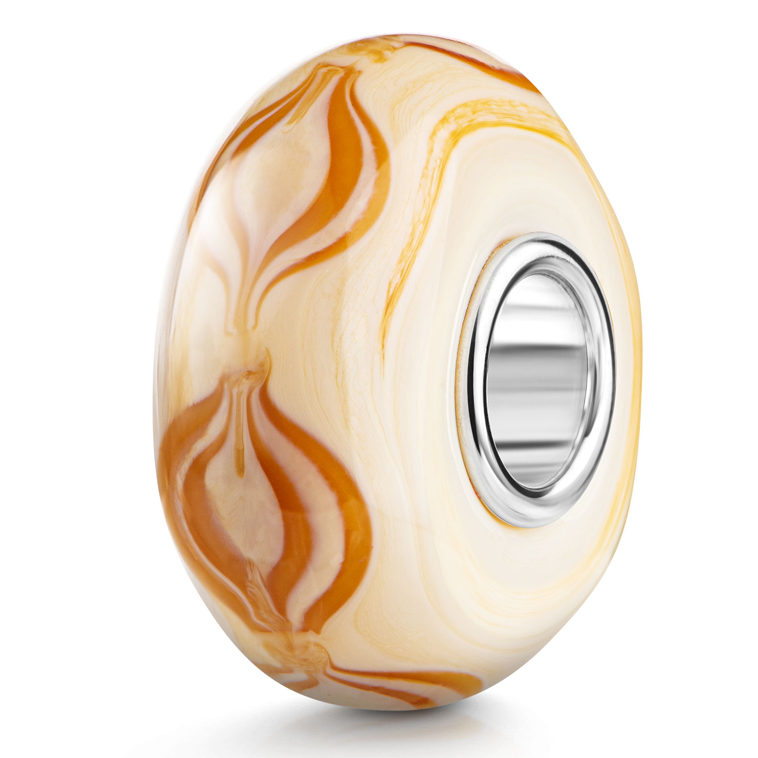 Beiger Glas Bead mit orangenem Wellenmuster. Der Bead ist mit einer Hülse aus massivem 925 Sterling Silber ausgestattet. Er ist passend zu allen gängigen Beads Armbändern und Ketten bis max. 4,4mm Breite und ist daher auch besonders für alle gängigen großen Beads Marken geeignet.