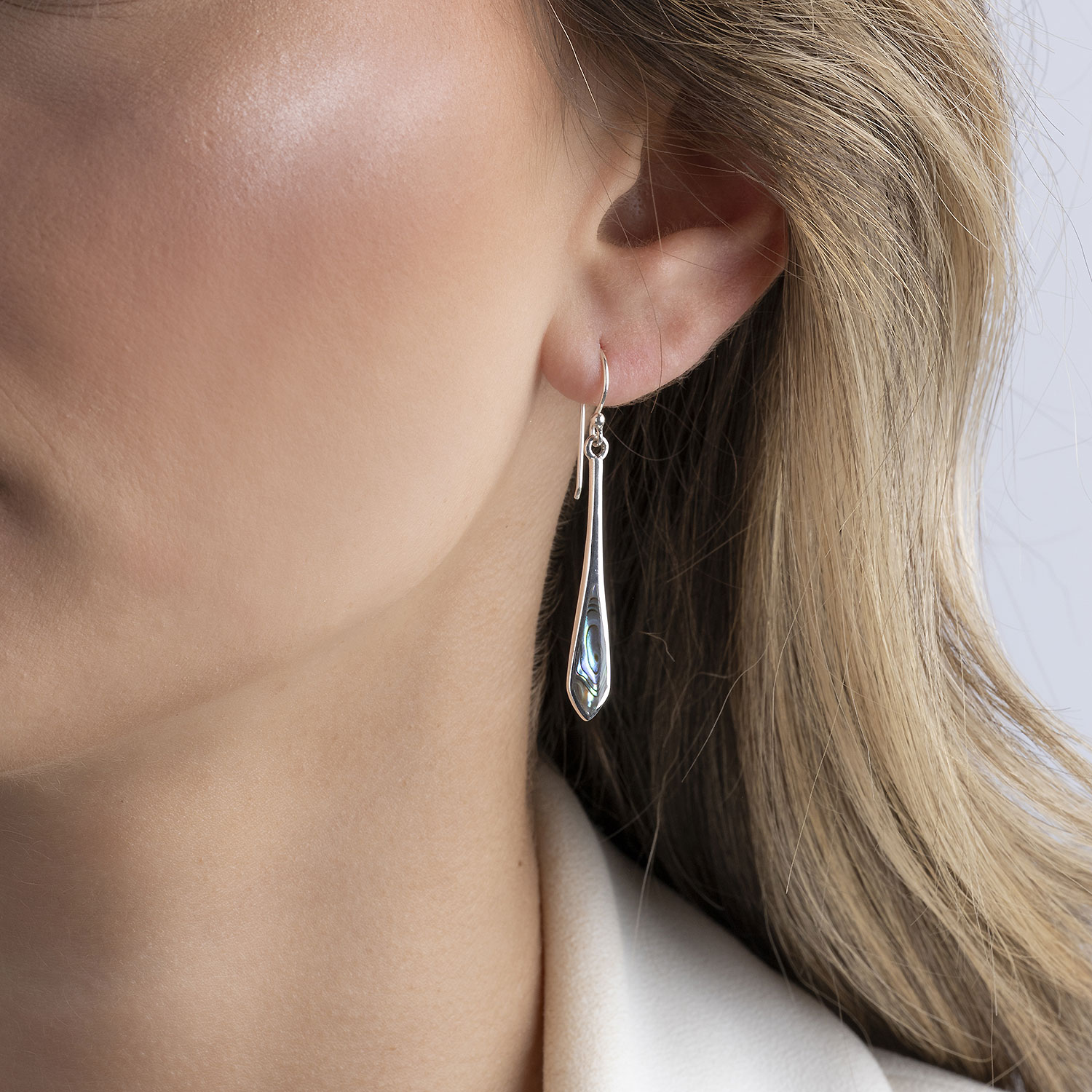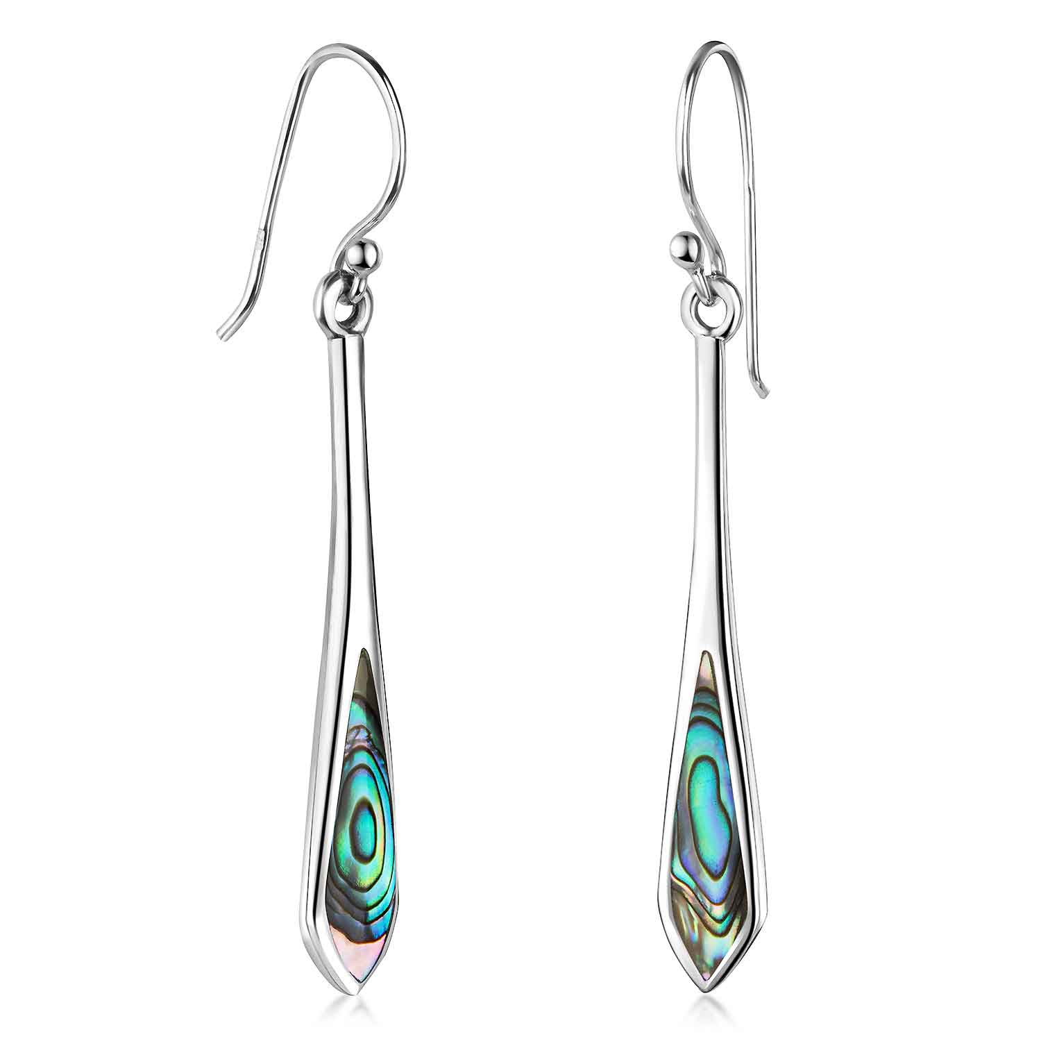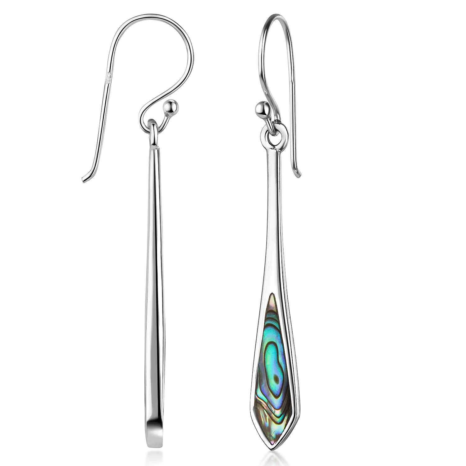 Unsere modischen langen Ohrhänger sind auf der Vorderseite mit je einem Stück Abalone (grünem Perlmutt) besetzt, welches besonders im Licht schön schimmert. Die Ohrringe wurden aus 925 Sterling Silber hergestellt und sind rückseitig mit einem Silberstempel versehen. Klassische Ohrhaken-Verschlüsse ermöglichen ein schnelles und unkompliziertes An- und Ausziehen der Schmuckstücke.