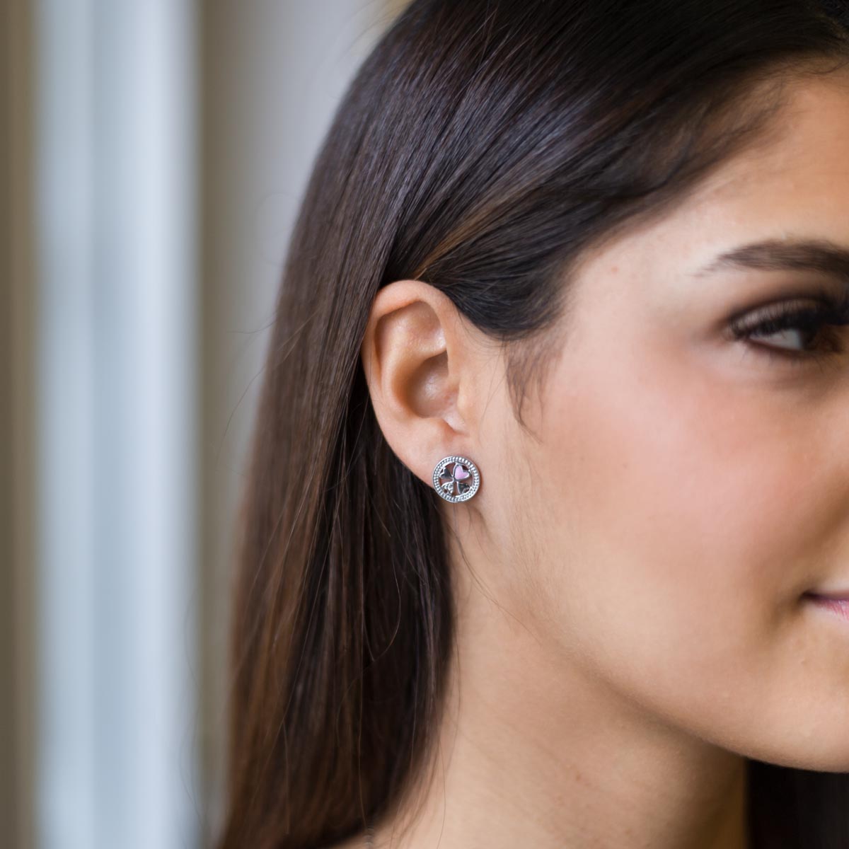 Liebevoll gearbeitete Ohrstecker mit je 4 Herzmotiven, gefertigt aus rhodiniertem 925 Sterling Silber. Die Herzen sind in einer filigranen runden Umrahmung eingeschlossen. Sie haben 3 unterschiedliche Oberflächen: Pink emailliert, hochglanzpoliert und geschmückt mit einem Zirkon.