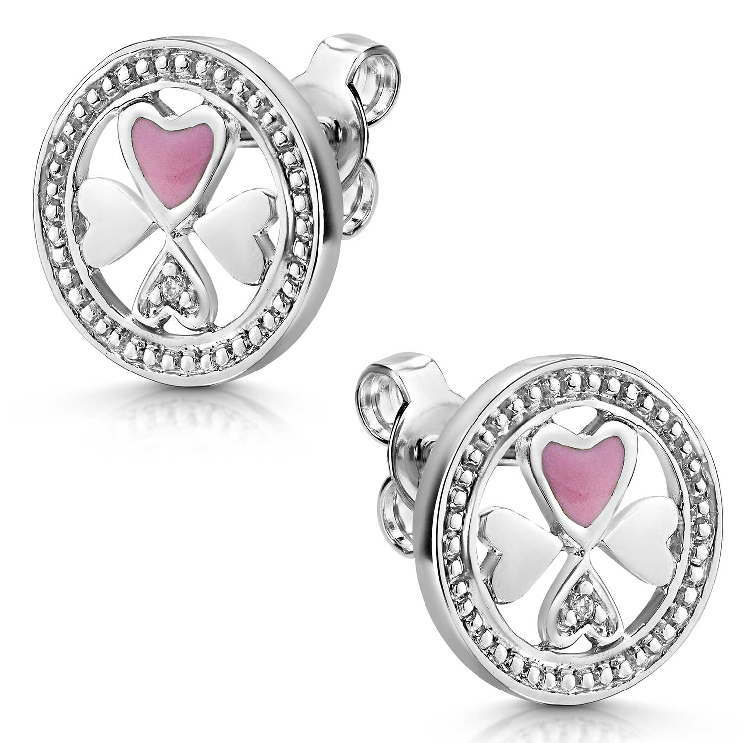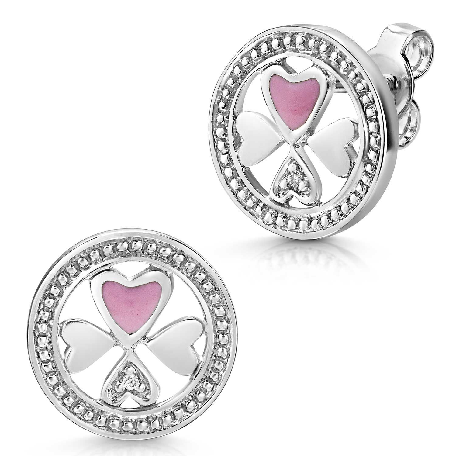 Runde 925 Silber Ohrstecker mit je 4 Herzen, welche teilweise mit Zirkonia Steinen und pinker Emaille verziert sind