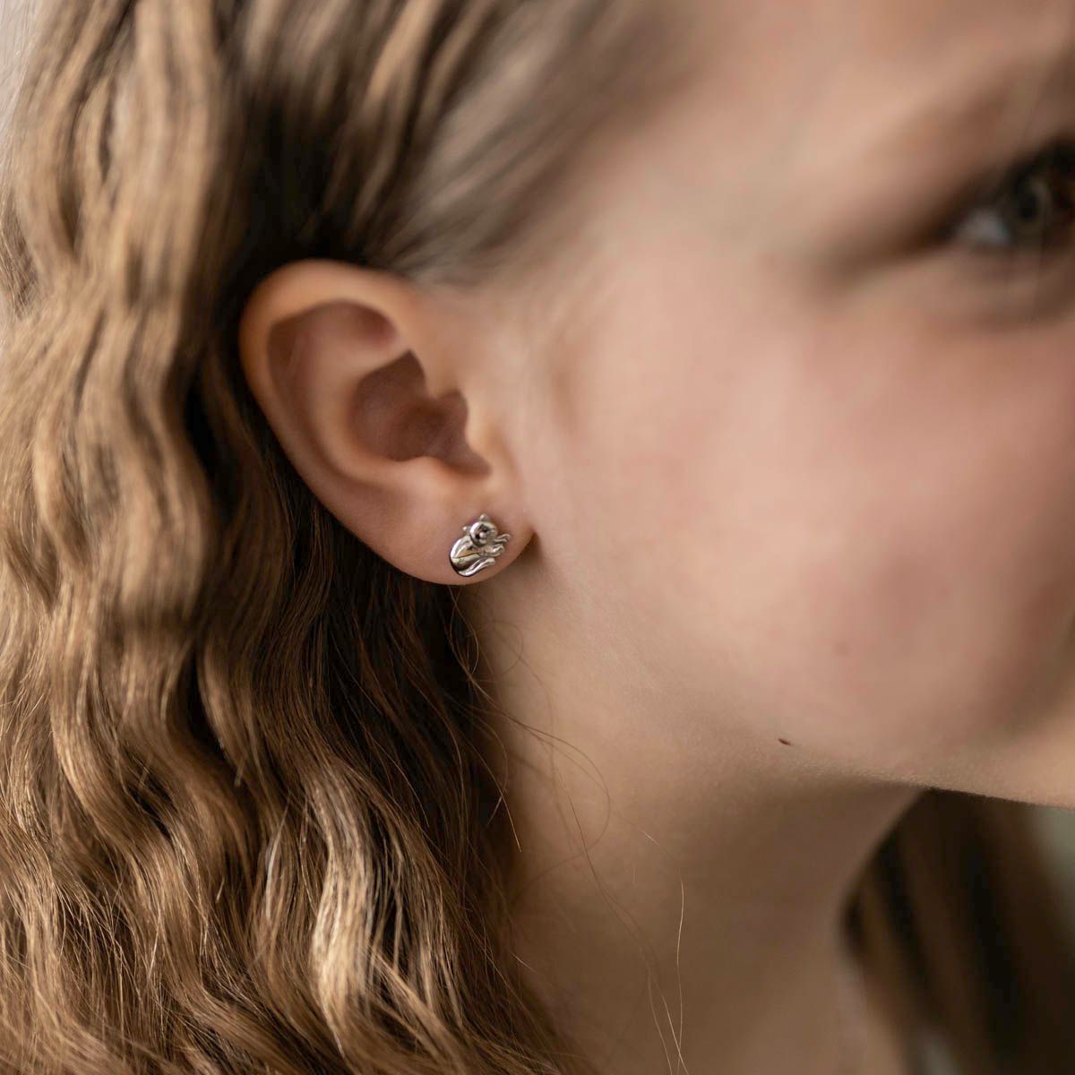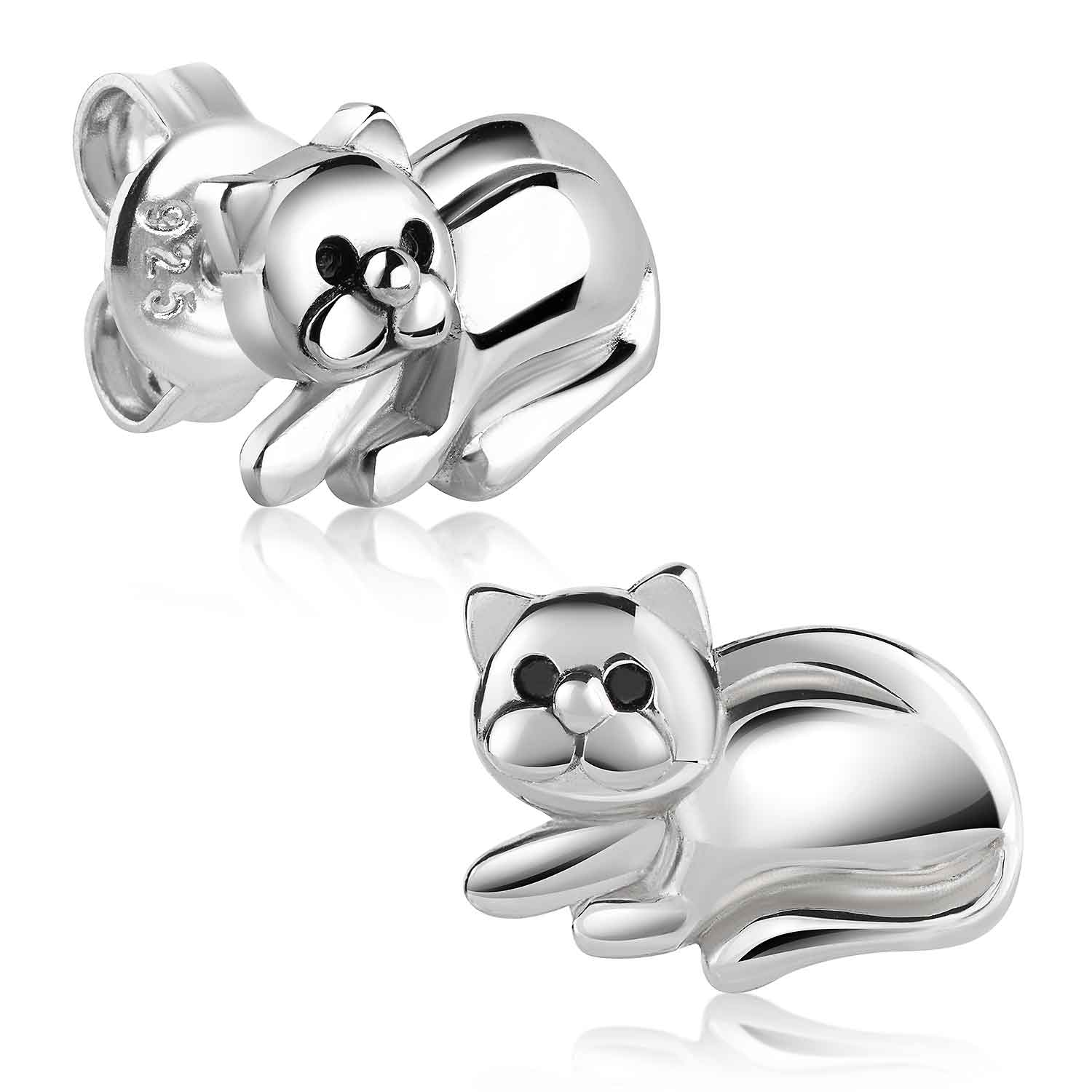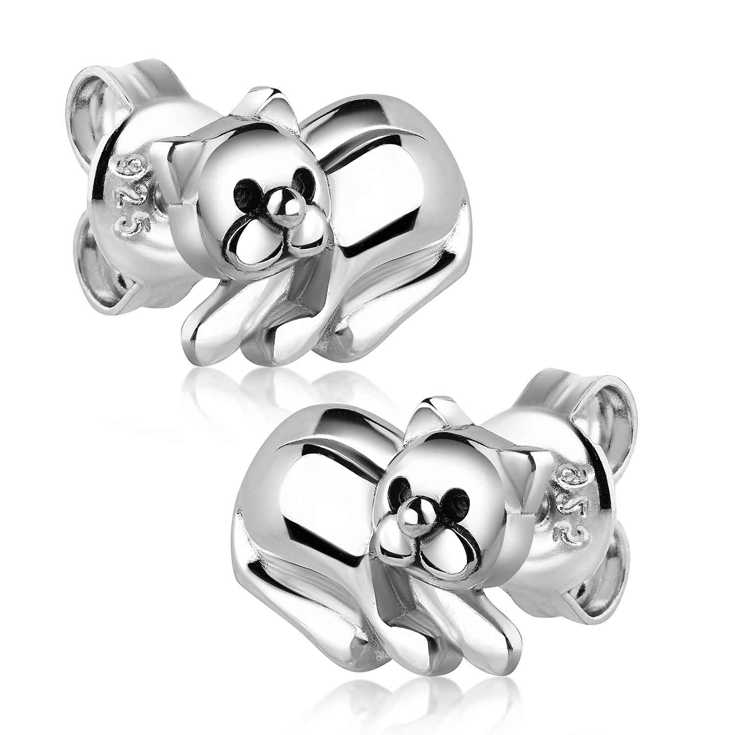 Süße Kinder Ohrstecker in Form von Katzen aus rhodiniertem 925 Sterling Silber. Durch die abgerundeten Kanten sind sie ideal für empfindliche Kinderohren.