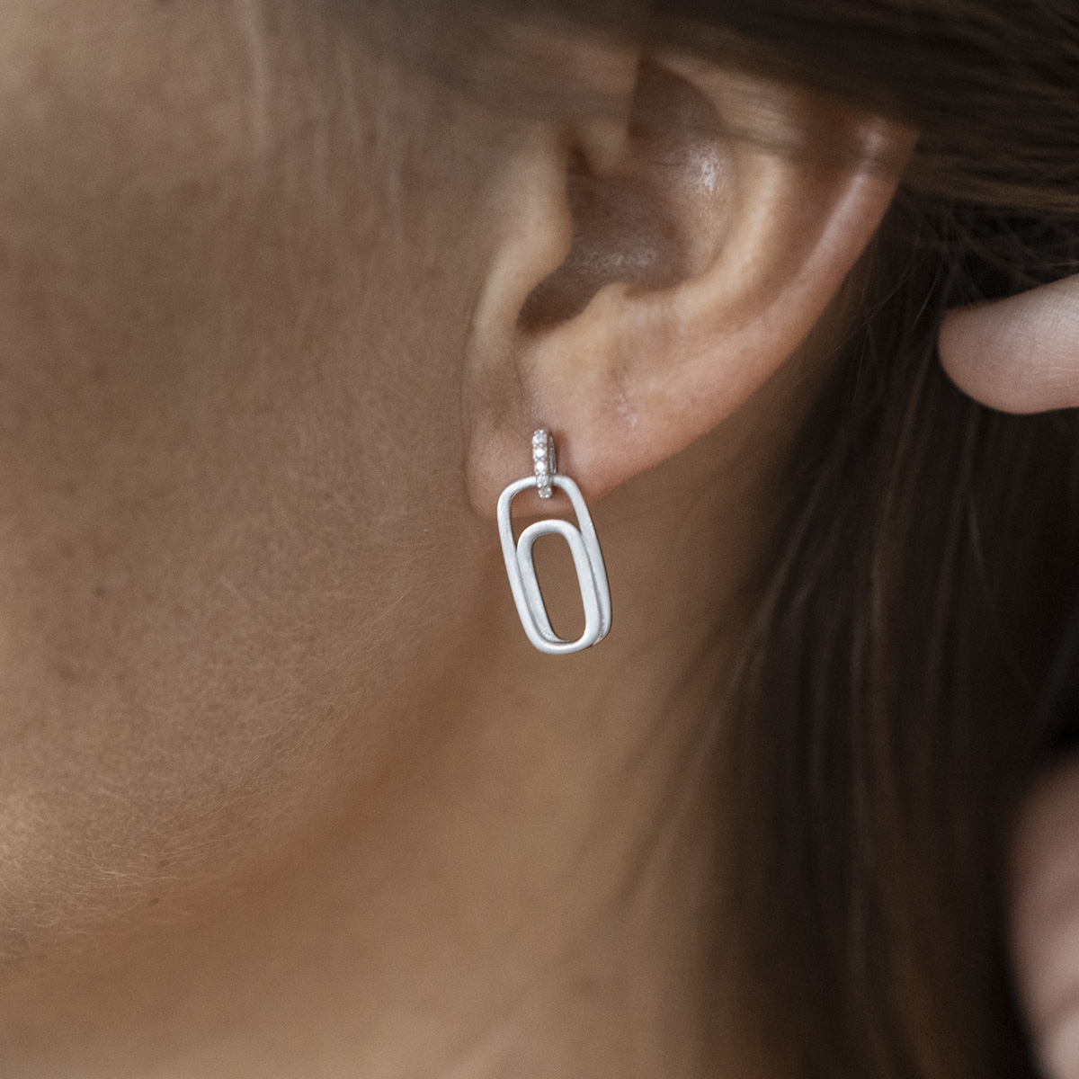Elegante Ohrstecker mit ovalen Anhängern aus rhodiniertem 925 Sterling Silber. Die Ohrringe sind auf der Vorderseite mattiert und mit weißen Zirkonia Steinen besetzt.