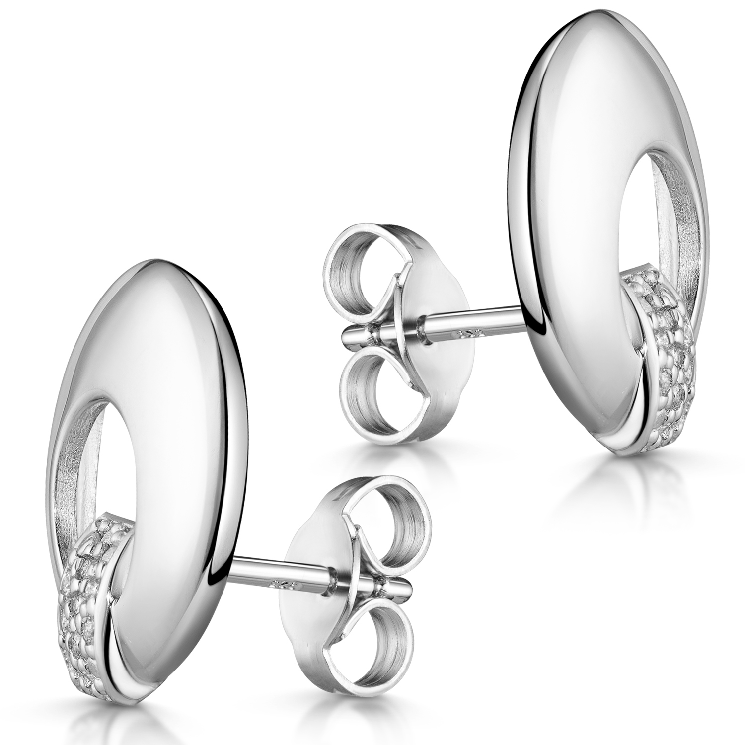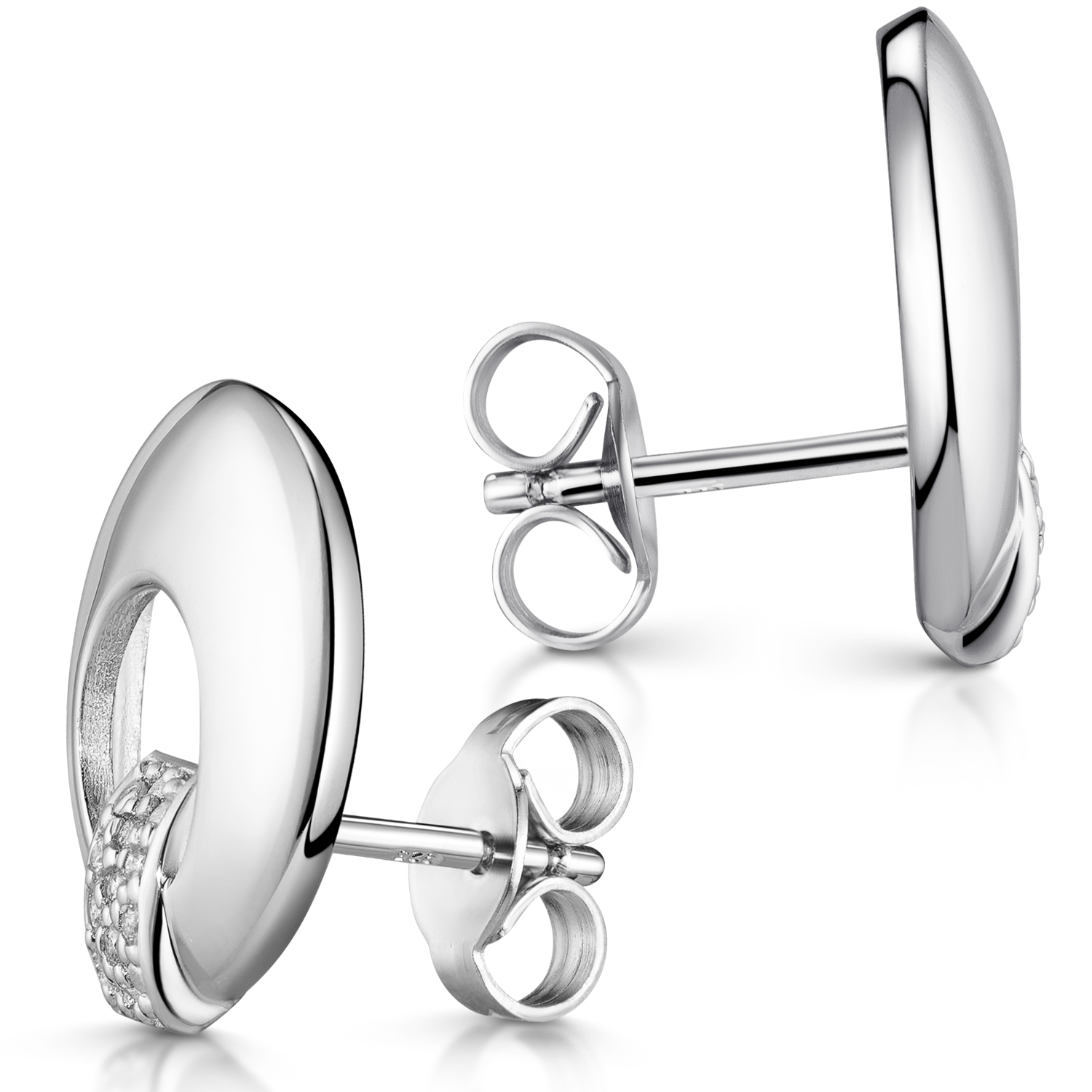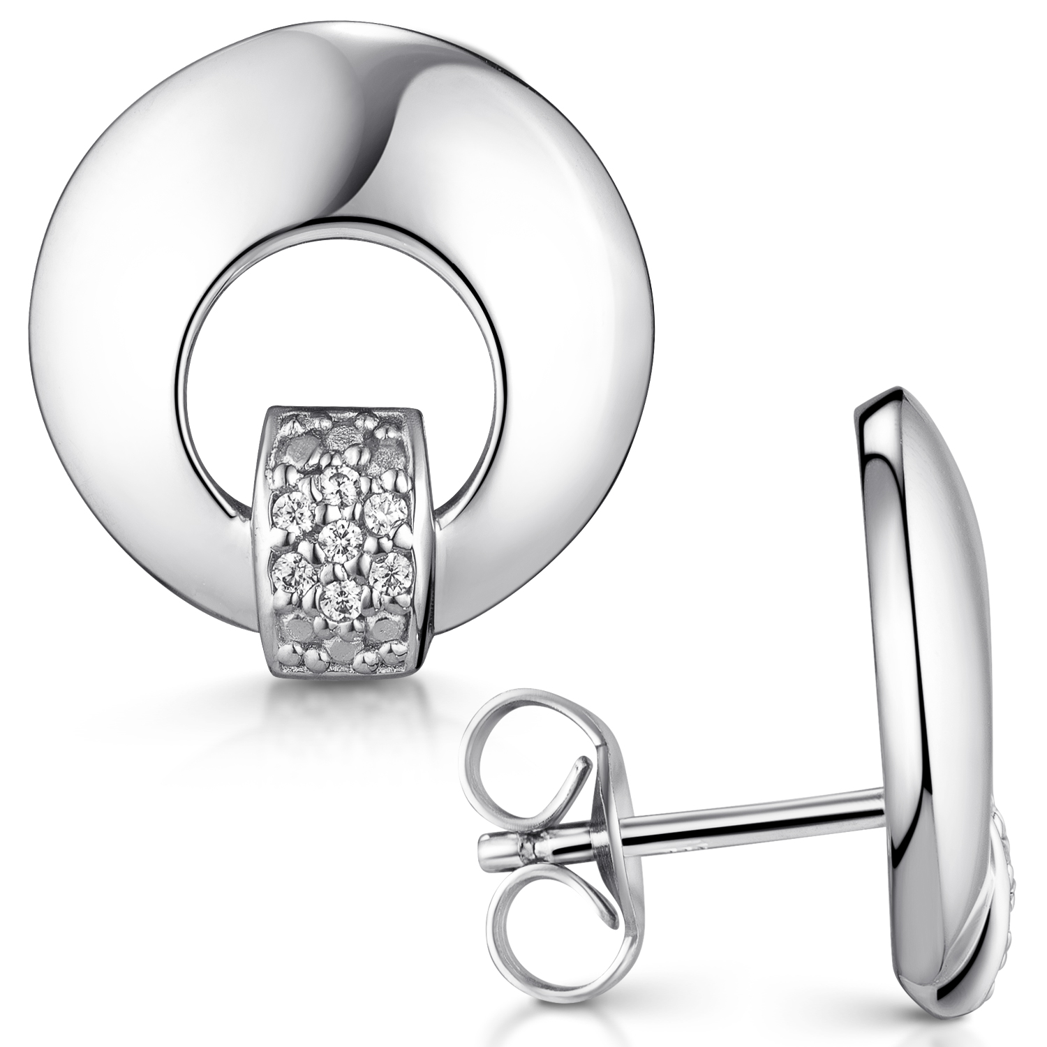 Die runden, leicht gewölbten Ohrringe sind aus 925 Sterling Silber gearbeitet. Die mit je 7 kleinen Zirkonia Steinchen besetzte Applikation wickelt sich wie ein Band um das obere Teil jeden Ohrsteckers. Die Ohrringe sind mit einer Rhodiumschicht gegen ein vorzeitiges Anlaufen geschützt. Unsere Schmuckschachtel-Sonderedition macht sie zu einem perfekten Geschenk.