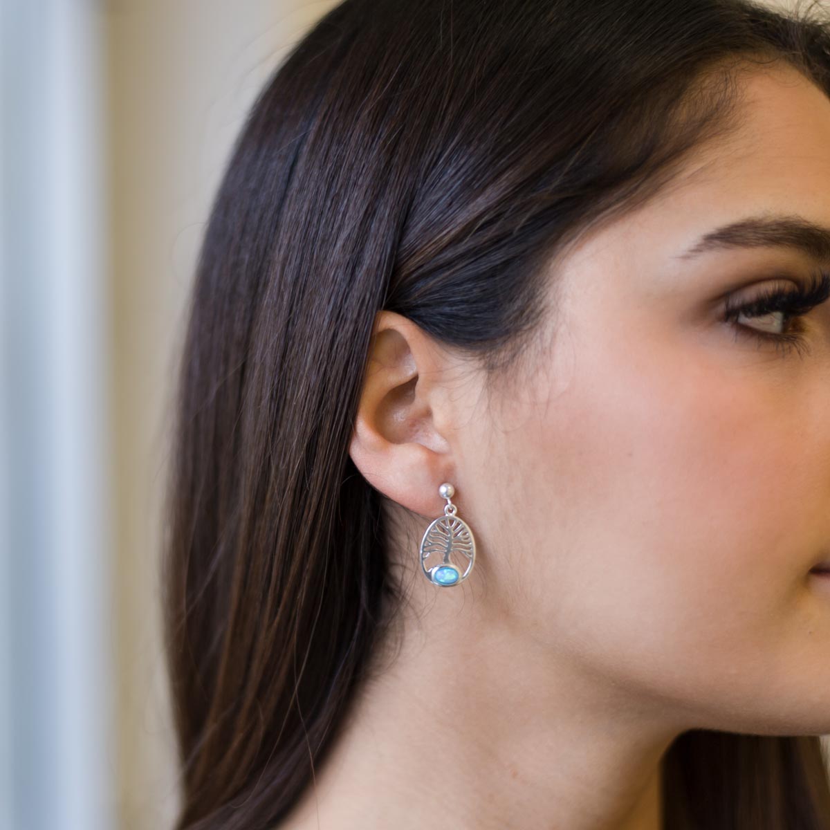 Ovale Opal Ohrhänger aus massivem 925 Silber mit Lebensbaum Motiv. Die Lieferung erfolgt inklusive Materia Schmuckbox.