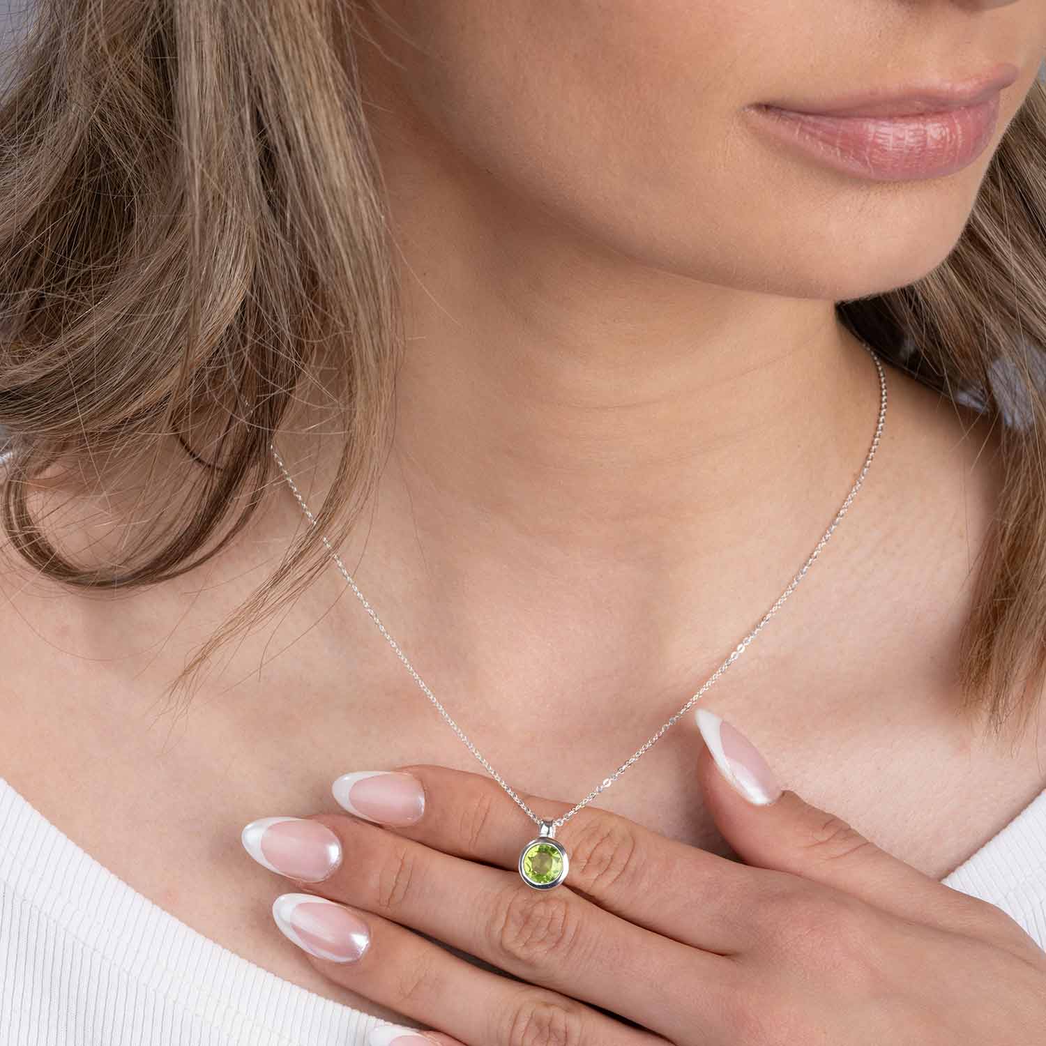 Für einen eleganten und doch dezenten Look sorgt unser runder Anhänger aus 925 Sterling Silber, der mittig mit einem facettierten Peridot geschmückt ist. Der Edelstein Kettenanhänger passt sowohl zur Alltags-, als auch zur Abendgarderobe und ist wahlweise mit einer längenverstellbaren Ankerkette in 42 bis 47cm Länge bestellbar.