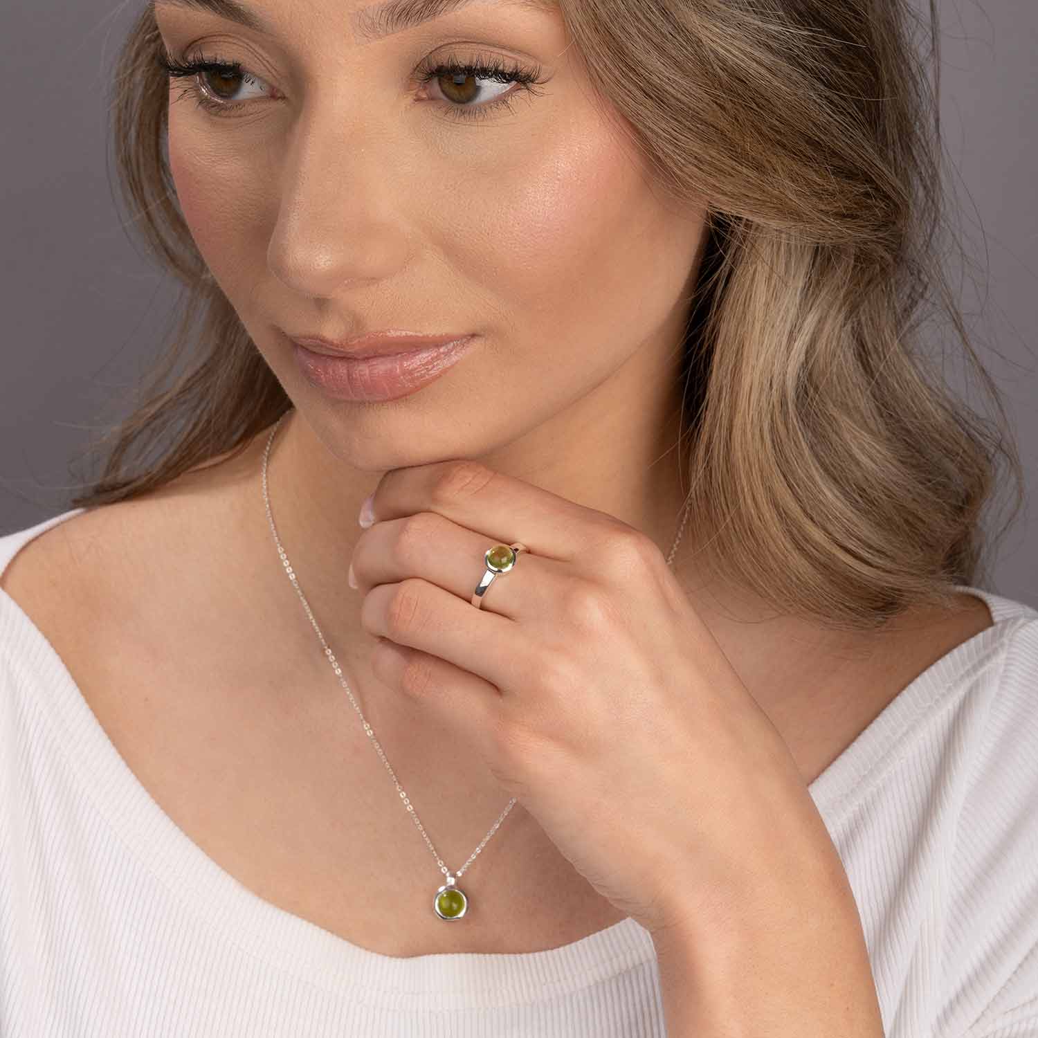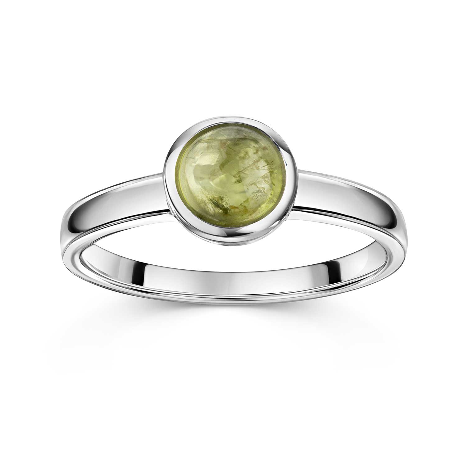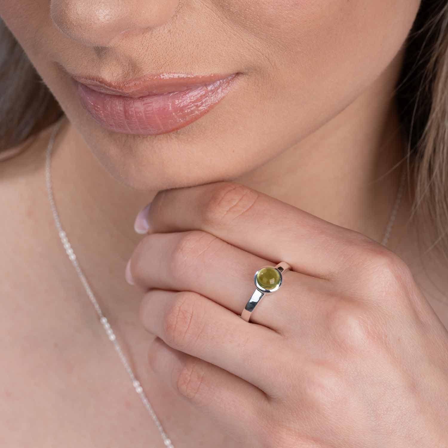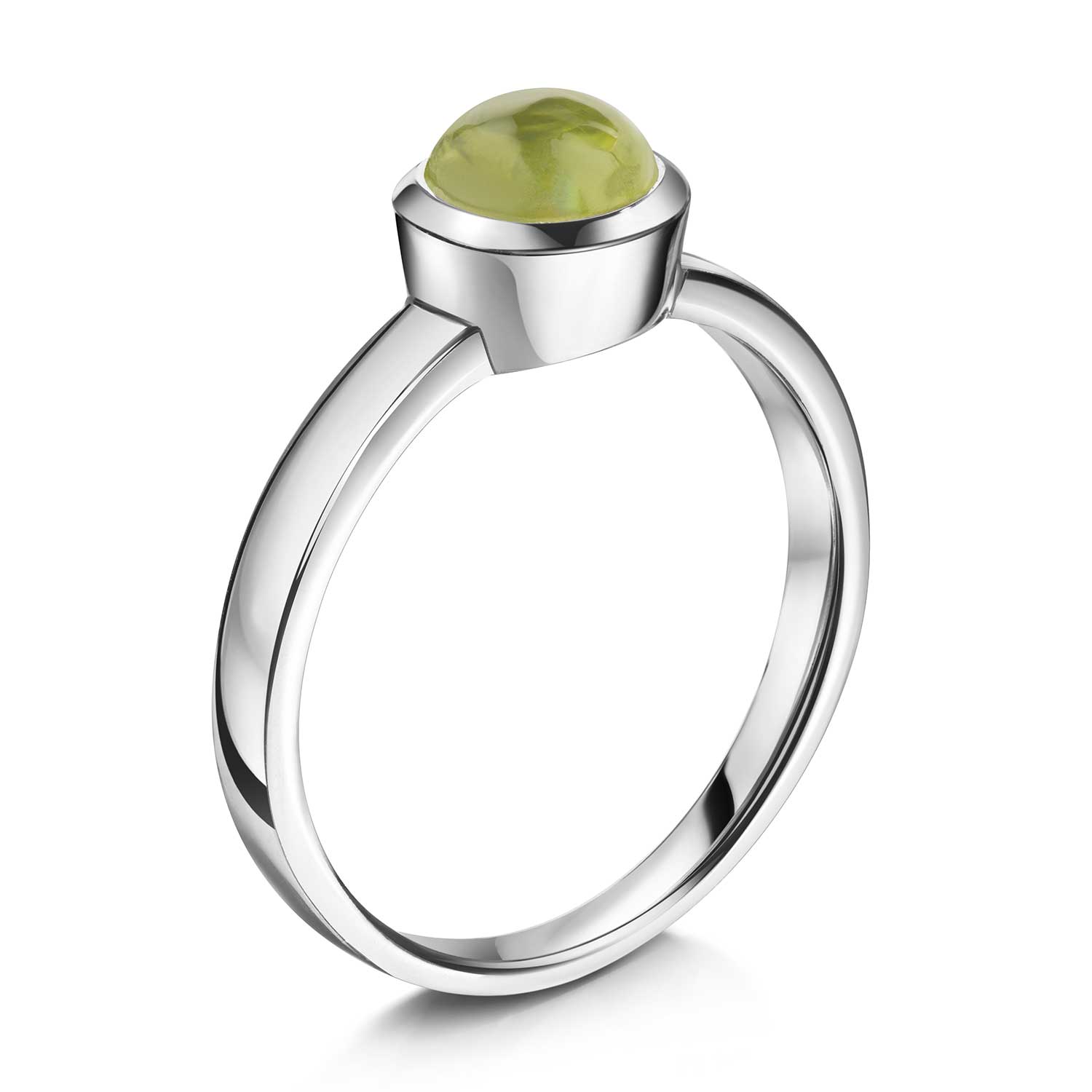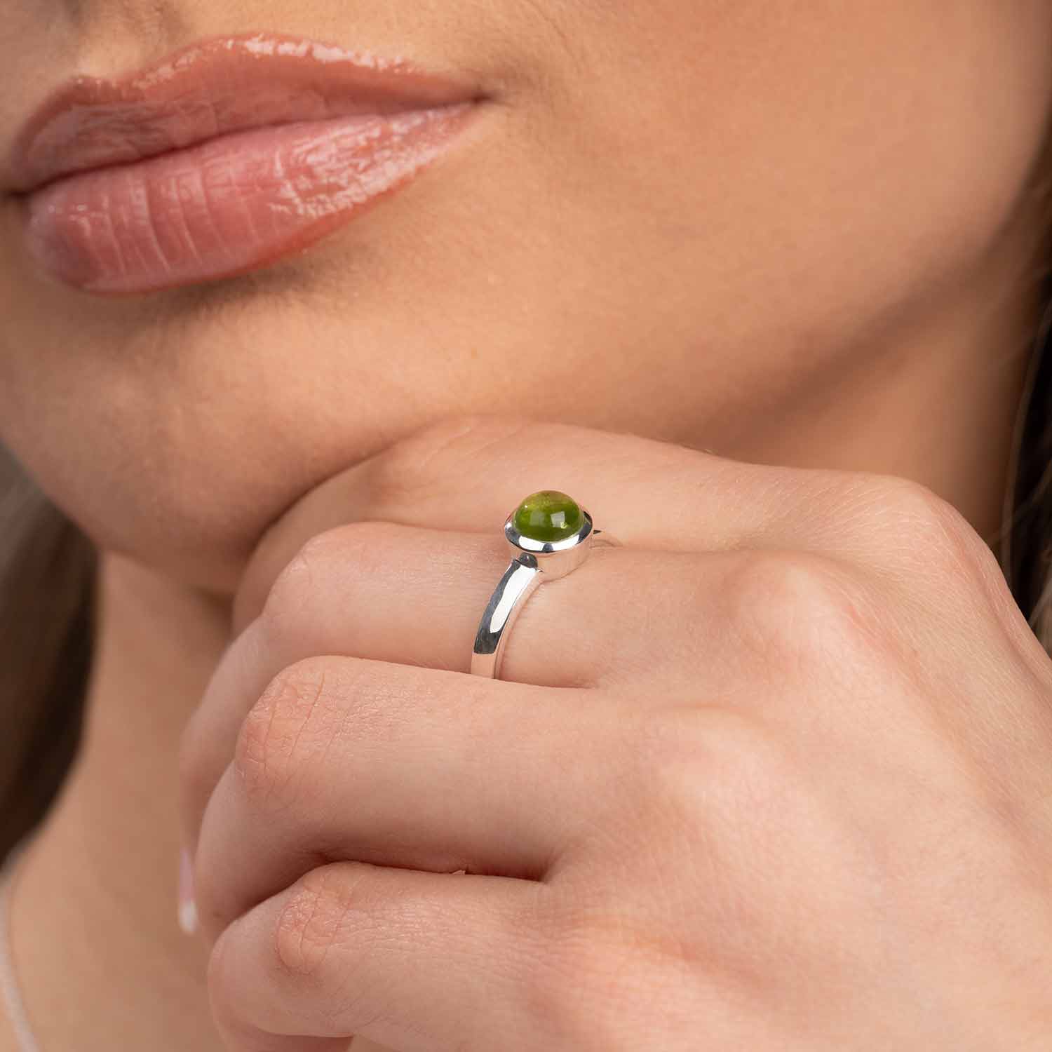 Für einen eleganten und doch dezenten Look sorgt unser runder Ring aus 925 Sterling Silber, der mittig mit einem Peridot im Cabochon-Schliff geschmückt ist. Der Edelstein Ring passt sowohl zur Alltags-, als auch zur Abendgarderobe.