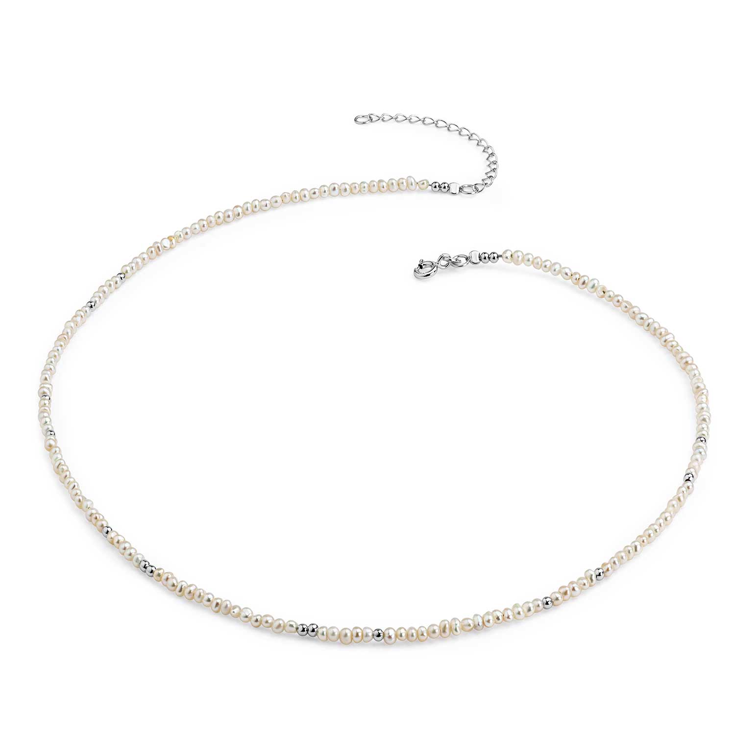 Zarte Halskette für Damen mit Süßwasserzuchtperlen und kleinen Kugeln aus 925 Sterling Silber. Über ein Verlängerungskettchen ist die Perlenkette von 42 bis 47cm stufenlos verstellbar.