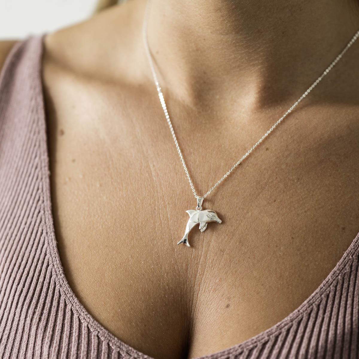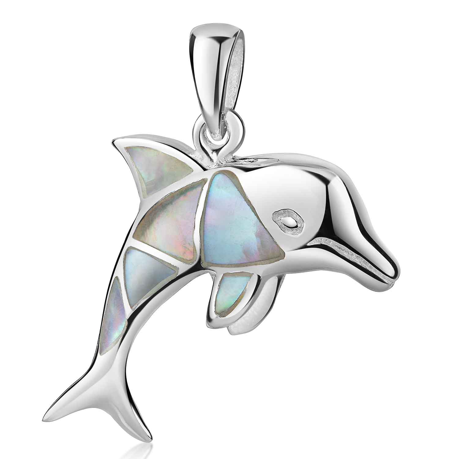 Schimmernder Delfin Kettenanhänger mit weißem Perlmutt aus 925 Sterling Silber. Der Anhänger ist wahlweise mit einer passenden Ankerkette im Set erhältlich.