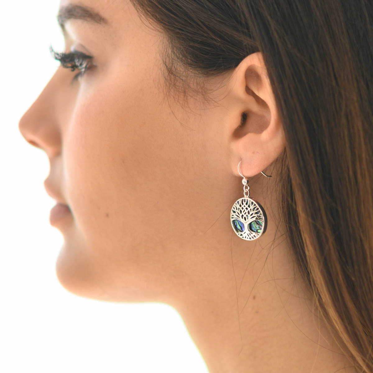 Unsere Damen Lebensbaum Ohrhänger wurden aus 925 Sterling Silber gearbeitet. Sie sind auf der Rückseite mit je einer runden, massiven Perlmuttscheibe (Abalone) versehen, welche auf der Vorderseite einen wunderschönen, grünlichen Hintergrund zum Lebensbaum abgibt. Ausgeliefert werden die Schmuckstücke in einer schwarzen Materia Schmuckschachtel. Sie eignen sich damit auch hervorragend als Geschenk für Ihre Liebsten.