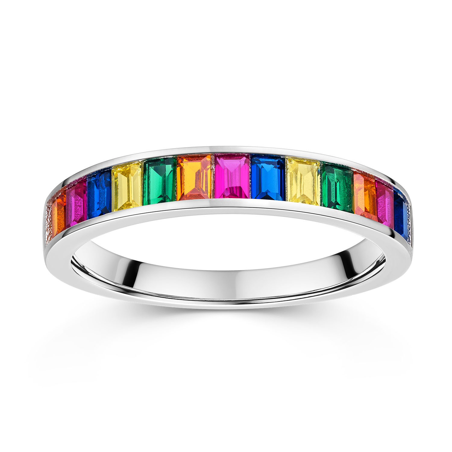 Strahlender Damen Ring aus rhodiniertem 925 Sterling Silber, besetzt mit bunten Zirkonia Steinen.