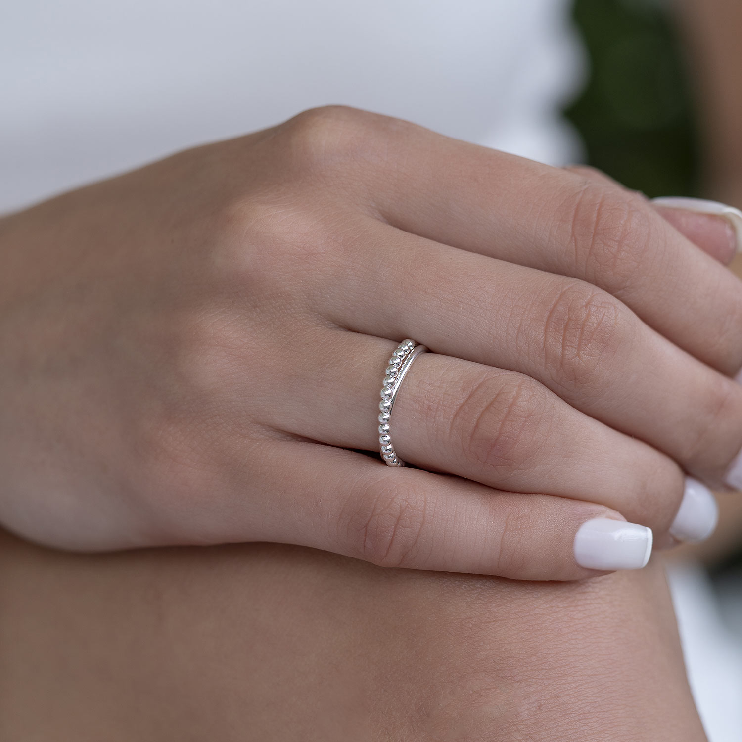 An unserem zarten Damenring aus 925 Sterling Silber reihen sich zahlreiche kleine Silberkügelchen aneinander. Durch das schlichte Design lässt sich der Ring zu vielen Outfits und Anlässen tragen.