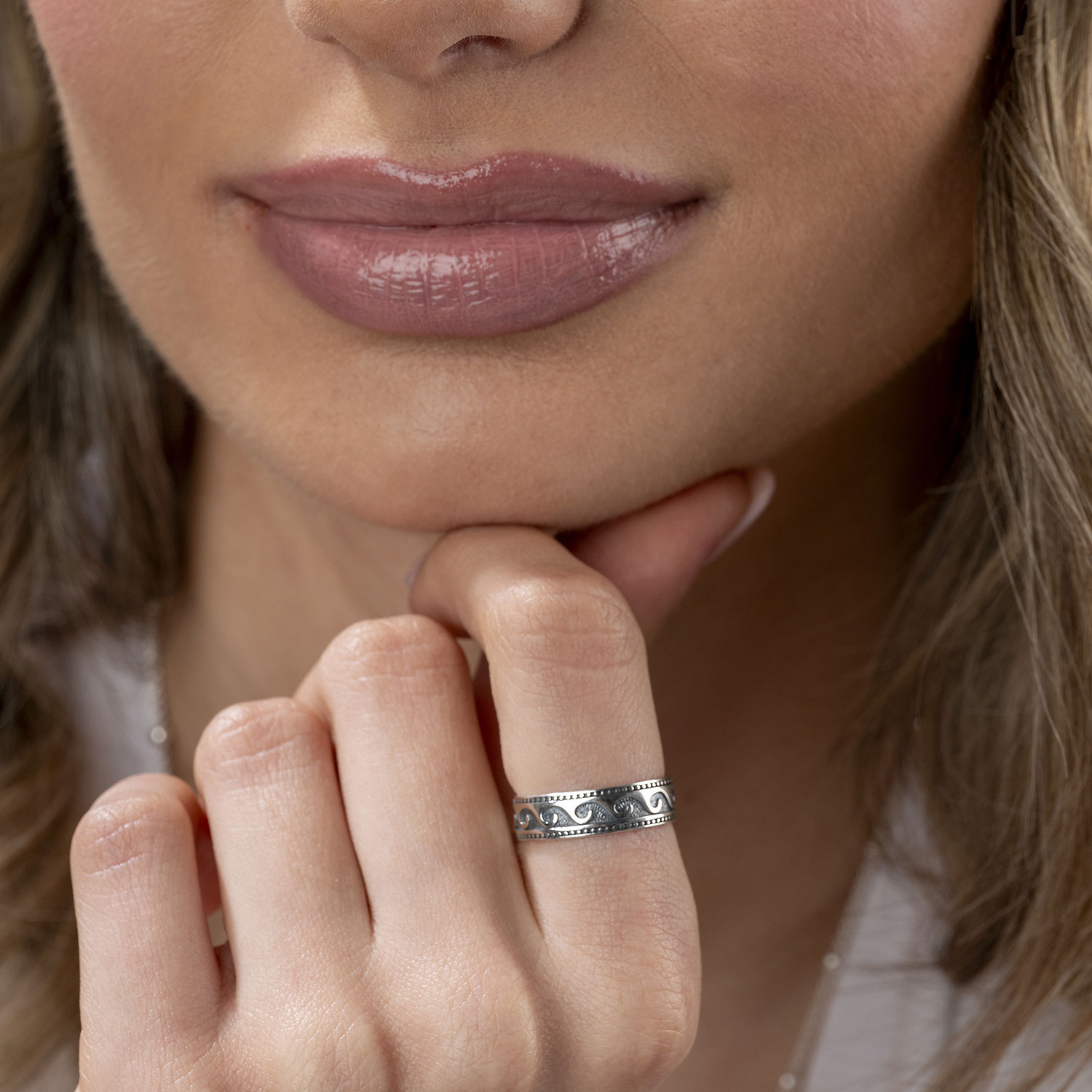 Der Wellen-Motiv des Rings symbolisiert den Fluss und die Harmonie des Lebens. Die geschwungenen Linien und sanften Kurven erinnern an die beruhigende Bewegung des Wassers und schaffen eine Verbindung zur Natur, die in jedem Schmuckstück zum Ausdruck kommt. Egal, ob Sie ihn im Alltag tragen oder zu besonderen Anlässen, dieser Silberring wird garantiert bewundernde Blicke auf sich ziehen.