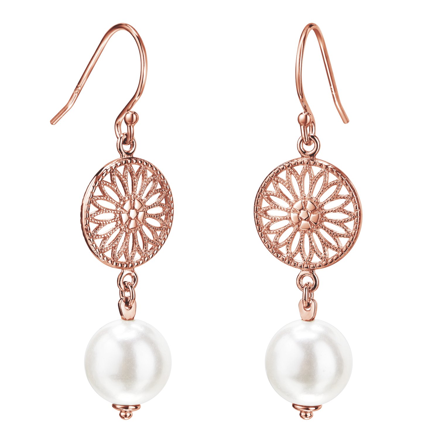 Perlen sind einfach zu jeder Zeit beliebt - sie wirken in ihrer Form und Aussehen sehr edel und elegant. Weiße Perlen in Kugel-Form sind am unteren Ende der Ohrringe befestigt und können somit frei am Ohr schwingen. Es handelt sich um natürliche Süsswasserzucht-Perlen, daher können sie in Farbe etwas abweichen und weisen natürliche Einschlüsse auf. Das filigrane Blumen-Motiv ist ebenfalls auf der Rückseite der Ohrringe ausgearbeitet.