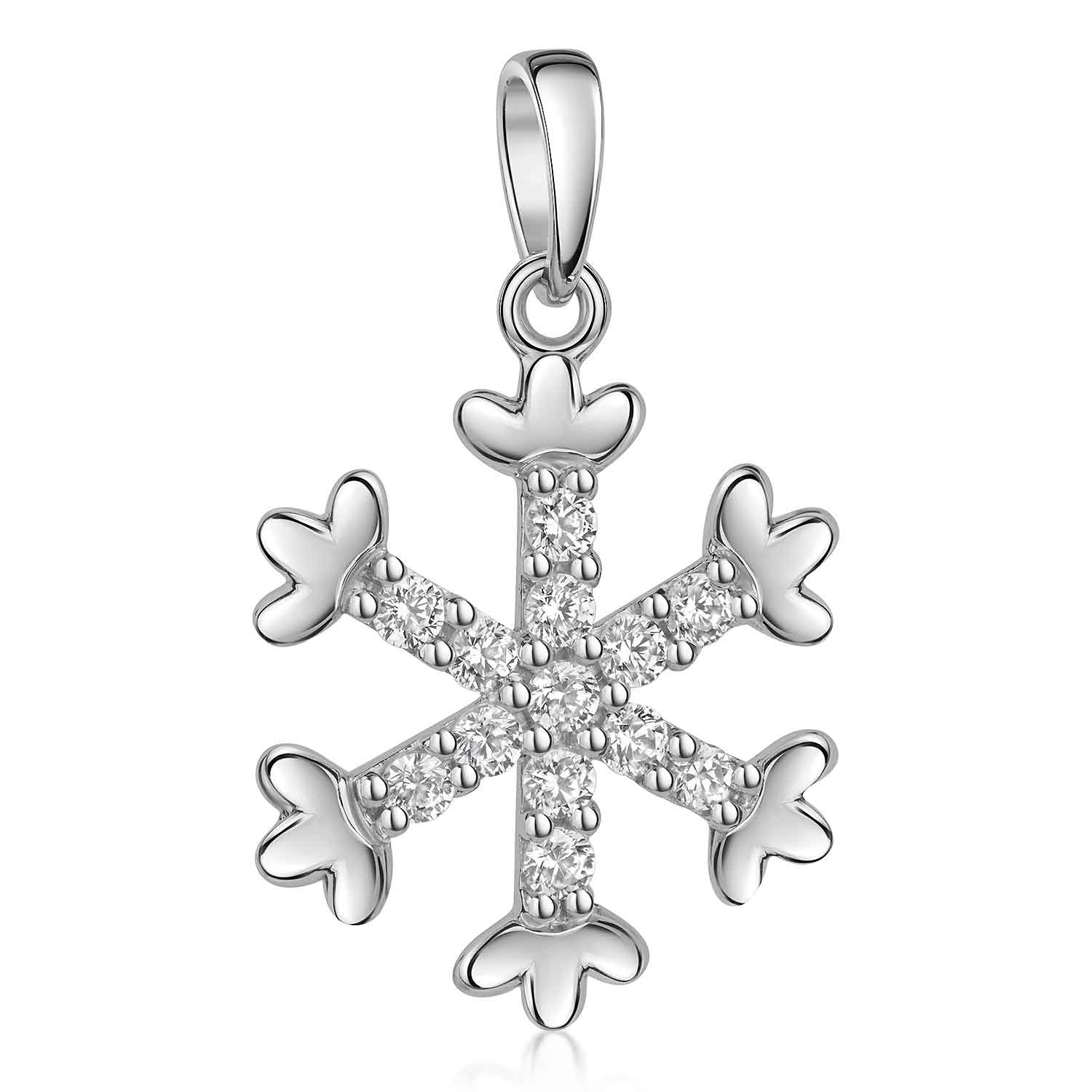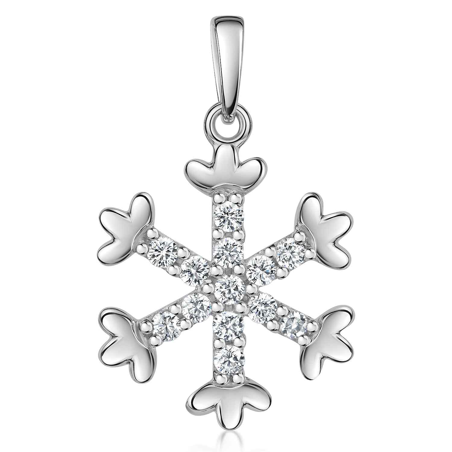 Winterlicher Schneeflocken Kettenanhänger aus rhodiniertem 925 Sterling Silber, besetzt mit 13 weißen Zirkonia. Wahlweise im Set mit einer Venezianerkette.
