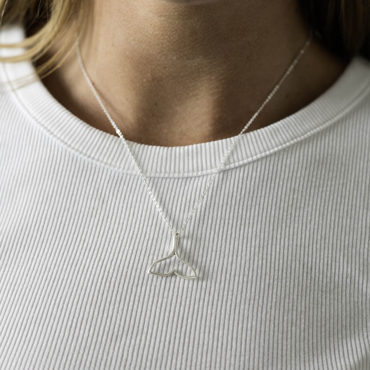 Kettenanhänger mit dem Umriss einer Schwanzflosse aus 925 Sterling Silber. Der Anhänger ist wahlweise mit einem passenden Stoffband im Set erhältlich.