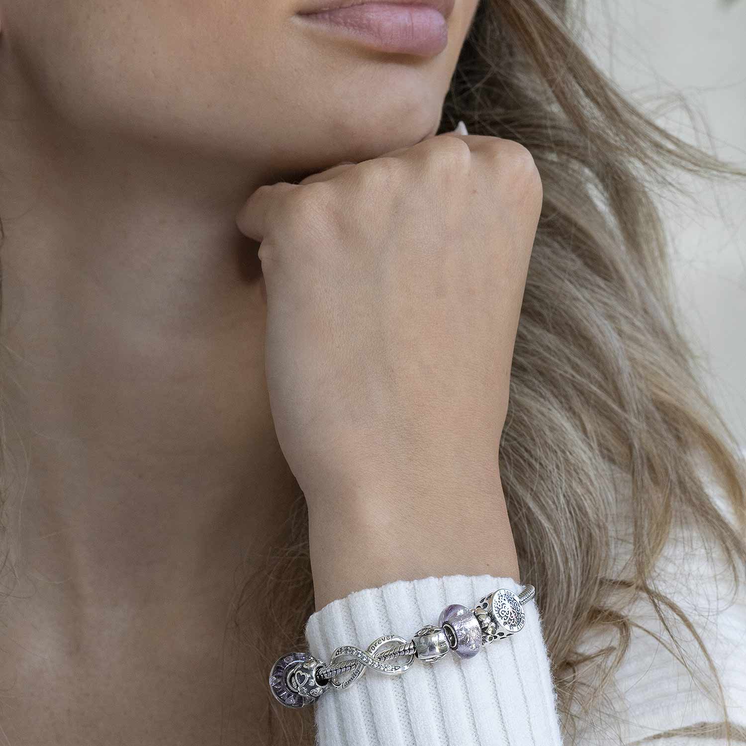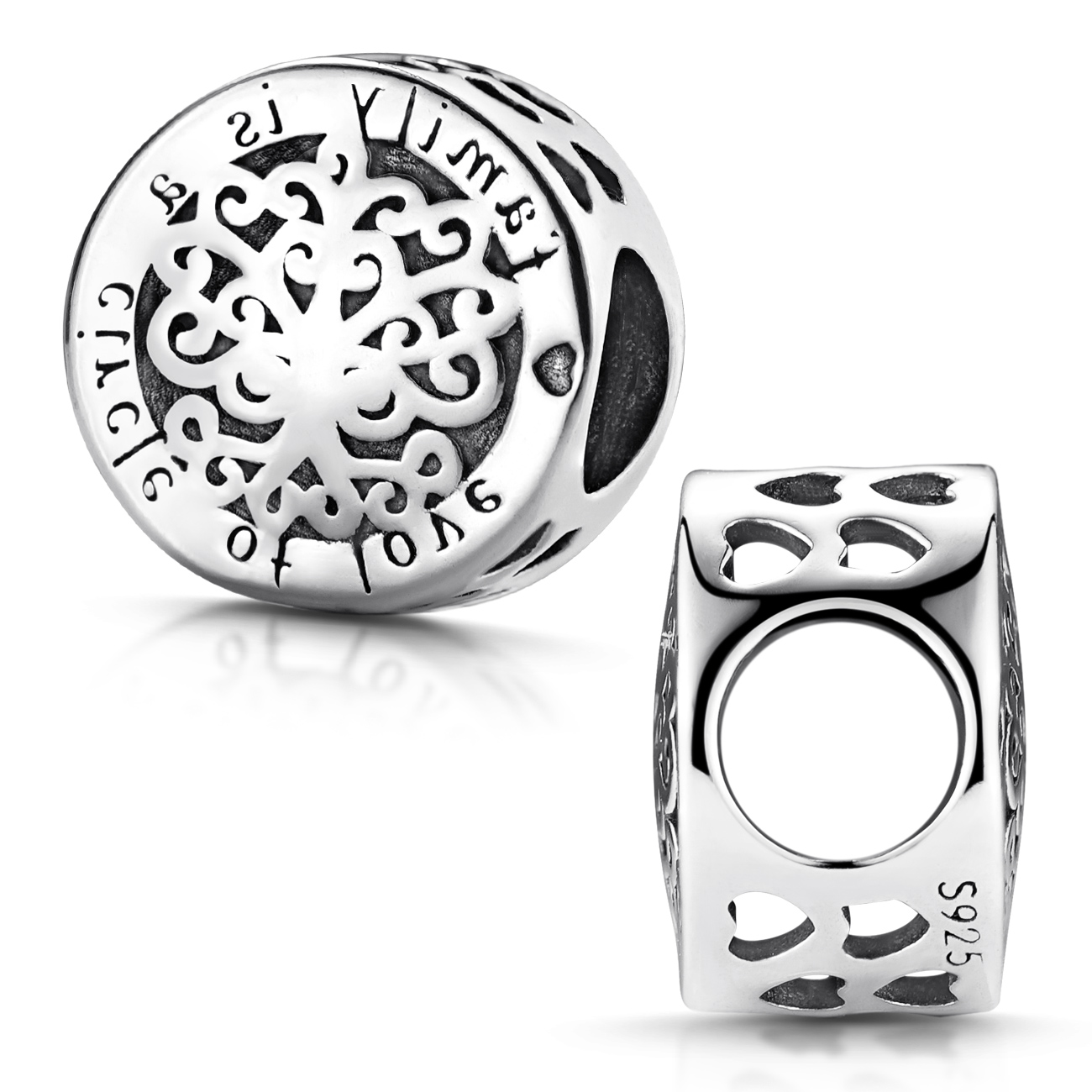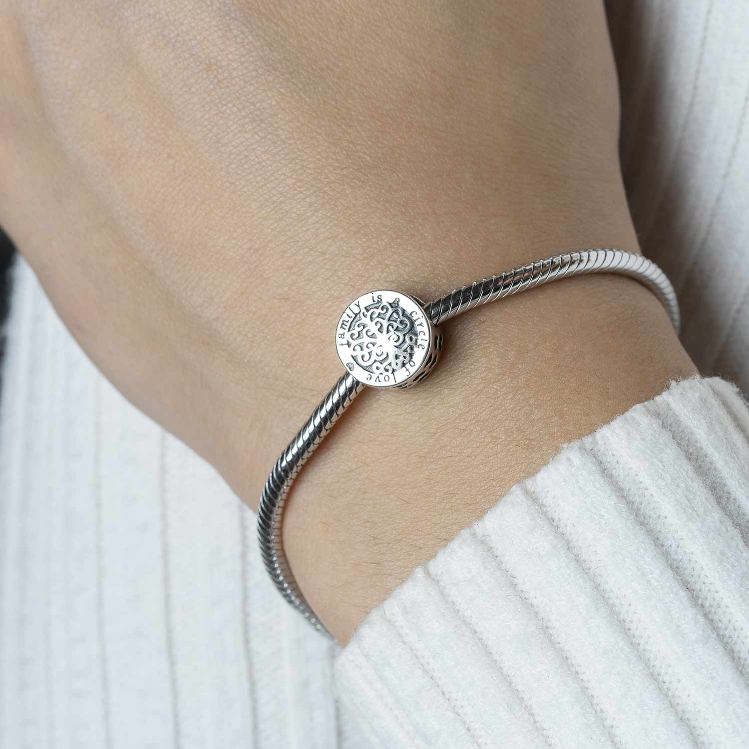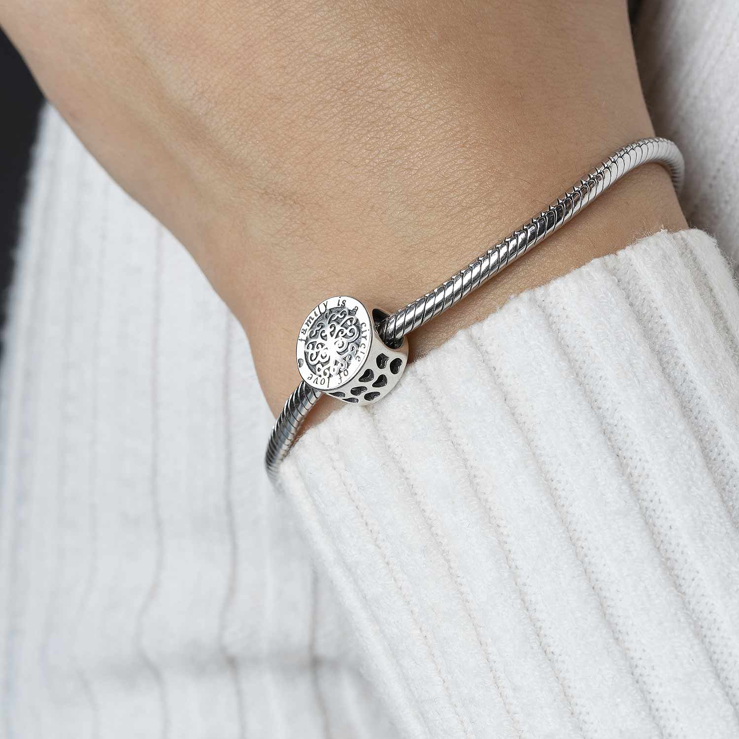 Runder Bead aus massivem 925 Sterling Silber verziert mit Herzen, dem Motiv eines Baumes und der liebevollen Botschaft "family is a circle of love". Der kleine Anhänger ist passend zu allen gängigen Bead Armbändern und Ketten bis max. 5mm Stärke.