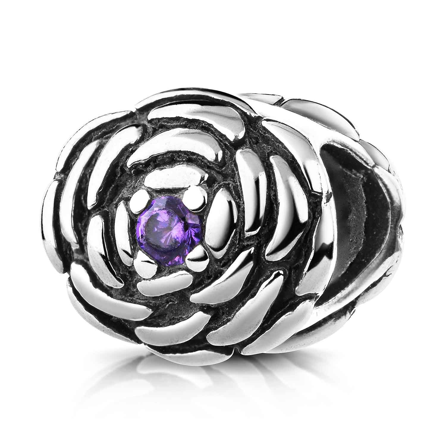 Dieser 925 Silber Beads antik Element ist beidseitig im Blumenmotiv und mit 2 lila Zirkonia gearbeitet. Durch eine gewollte Oxidierung des Silbers, erhält dieser Silber Bead, seine gewollte Antik-Optik. Dieser Bead ist passend zu allen gängigen Bead-Armbändern bis max. 4,4mm Breite, besonders zu den bekanntesten Bead-Marken auf dem Markt.