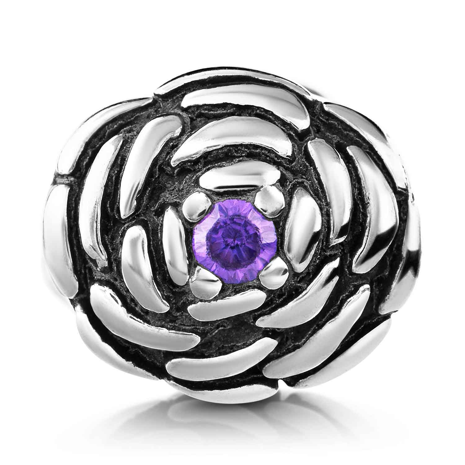 925 Silber Bead in Form einer Rosen Blüte, beidseitig mit einem Zirkonia in lila / violett besetzt.