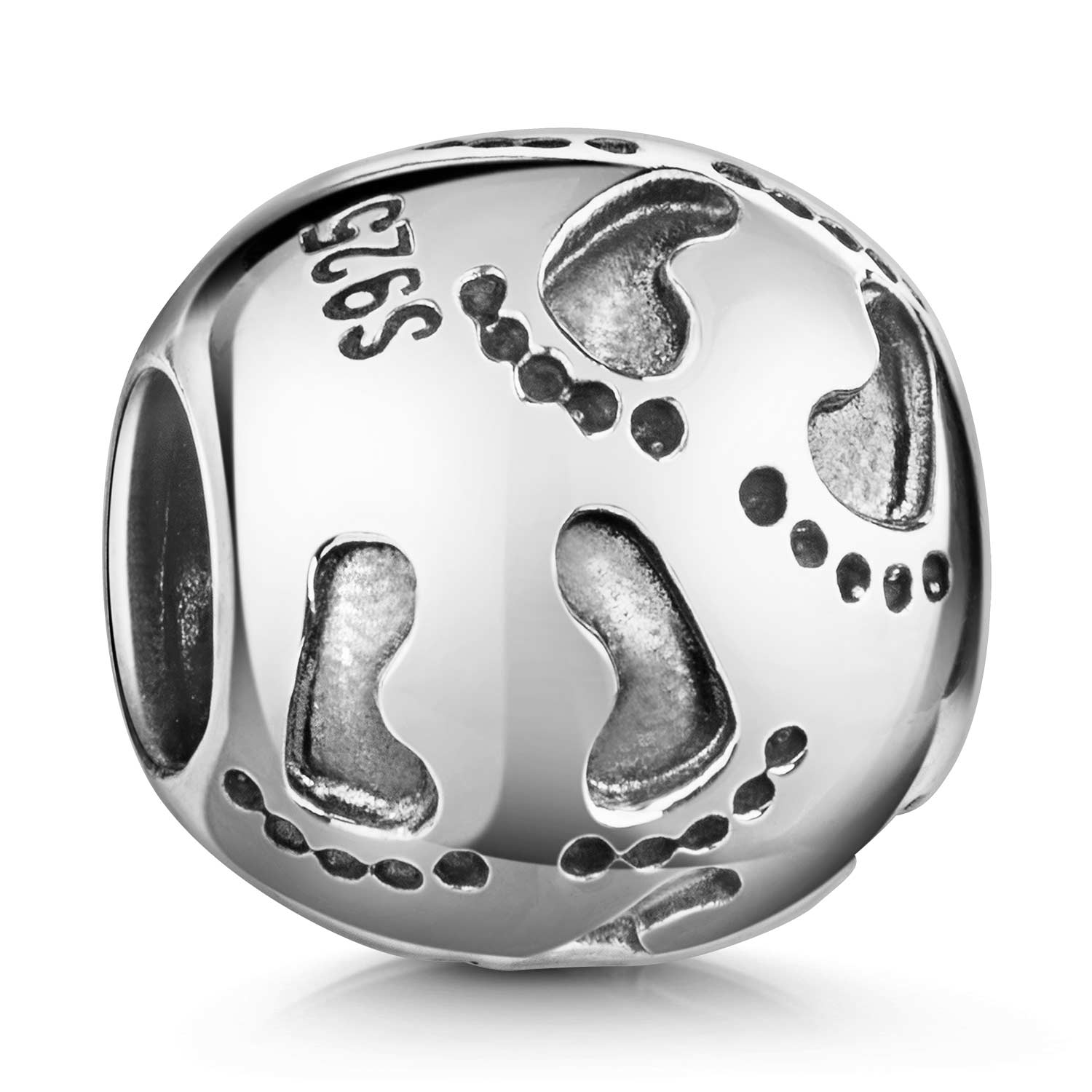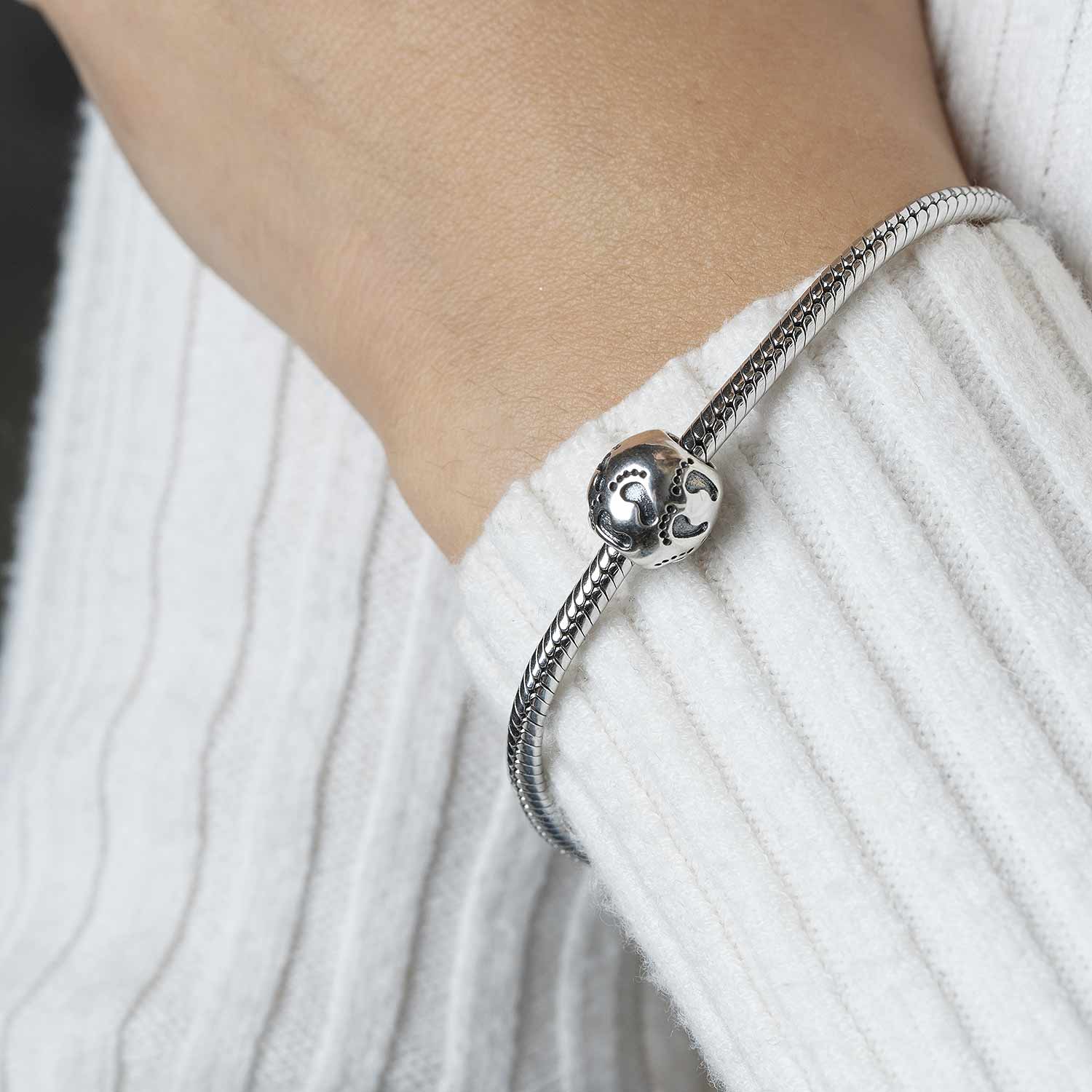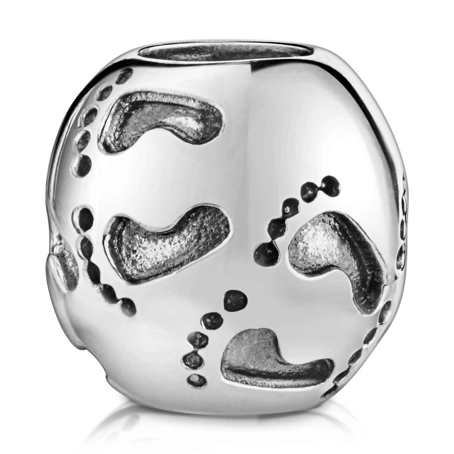 Dieser Bead aus massivem 925 Sterling Silber zeigt zahlreiche Fußabdrücke. Außerdem wurde der Charm Anhänger antik geschwärzt, was die Konturen und Details hervorhebt. Der Bead passt auf alle handelsüblichen European Armbänder und Ketten bis zu einer max. Stärke von 4,4mm.