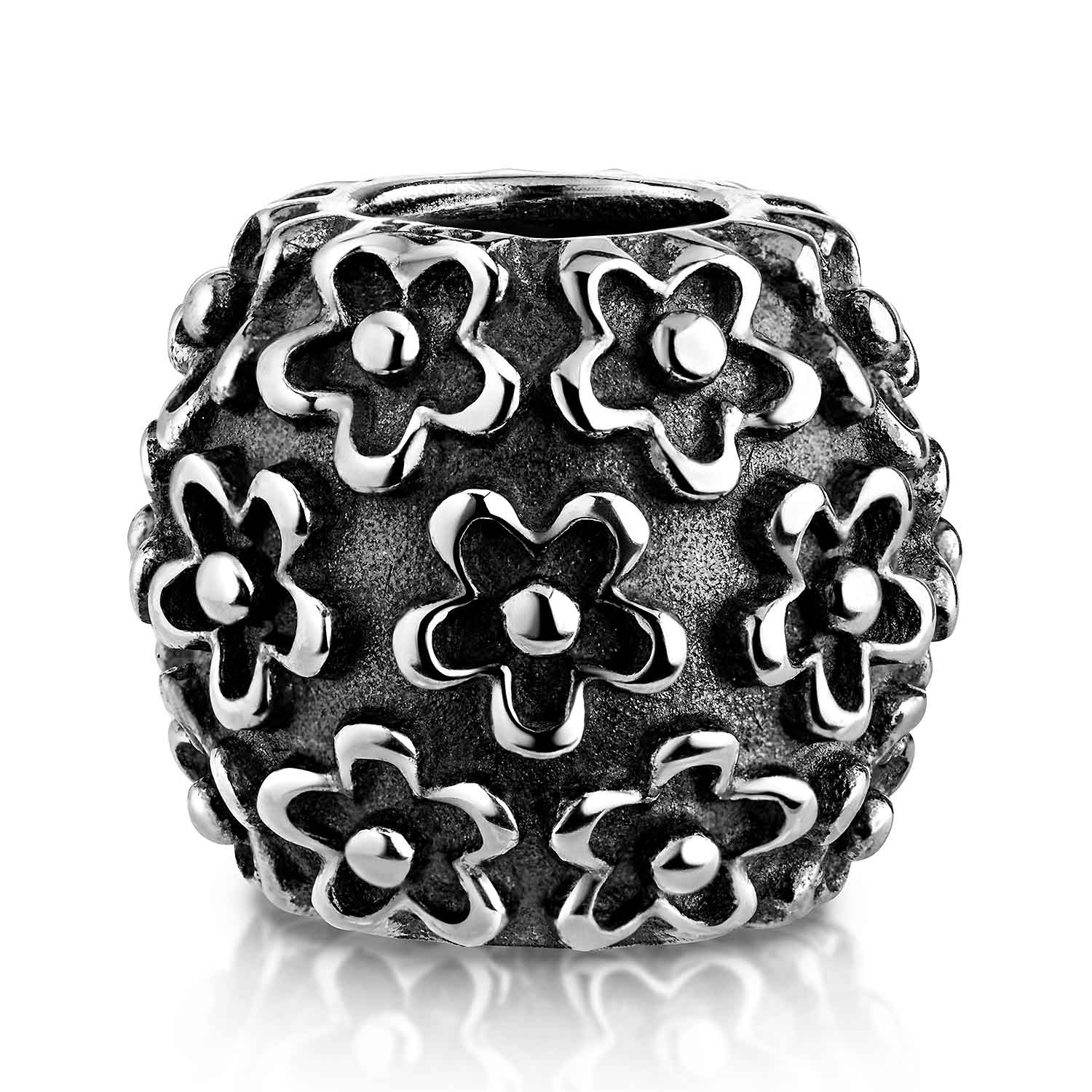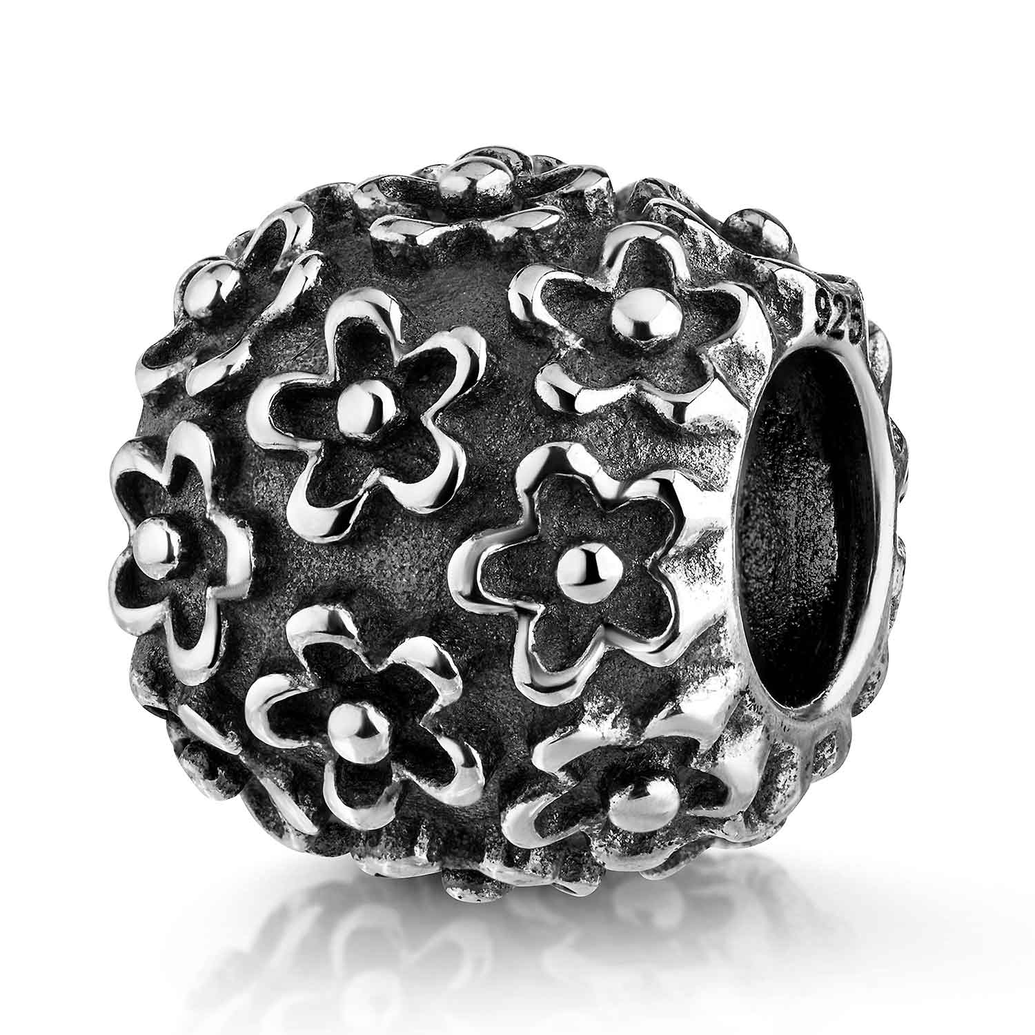 Unser 925 Silber Bead ist mit kleinen Blüten ausgearbeitet und entspricht höchsten Qualitätsanforderungen. Der Bead erhält durch eine gewollte Oxidierung des Silbers sein unverwechselbares Aussehen im antiken Look. Er ist passend zu allen gängigen Bead Armbändern/ Ketten bis max. 4,5mm Stärke und somit kompatibel zu fast allen Armbändern bekannter Marken.