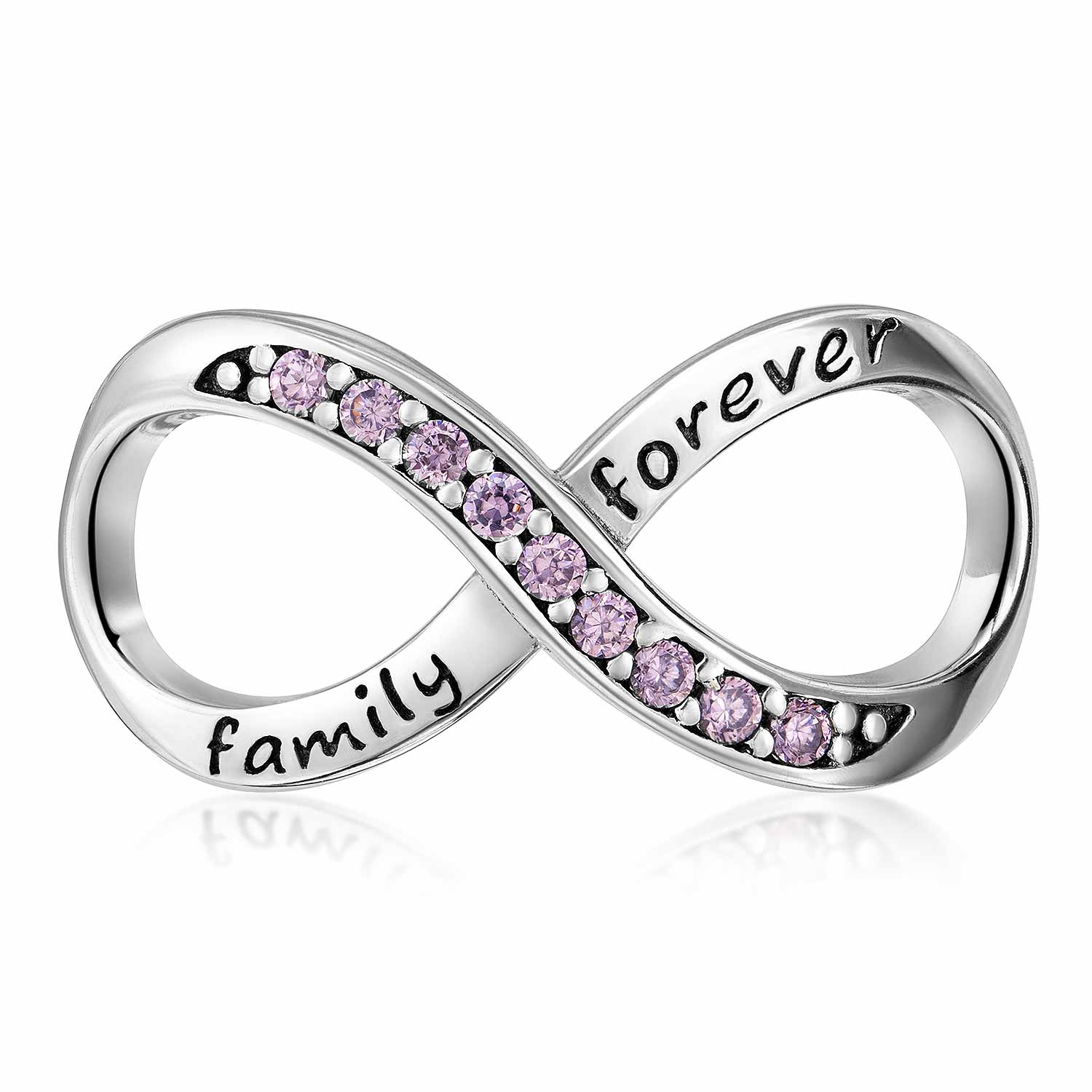 Unendlichkeits Bead mit Gravur "family forever" und rosa Zirkonia Steinen aus 925 Sterling Silber. Dieser Silber Anhänger ist passend für Beads Armbänder und Ketten bis 8,1mm.
