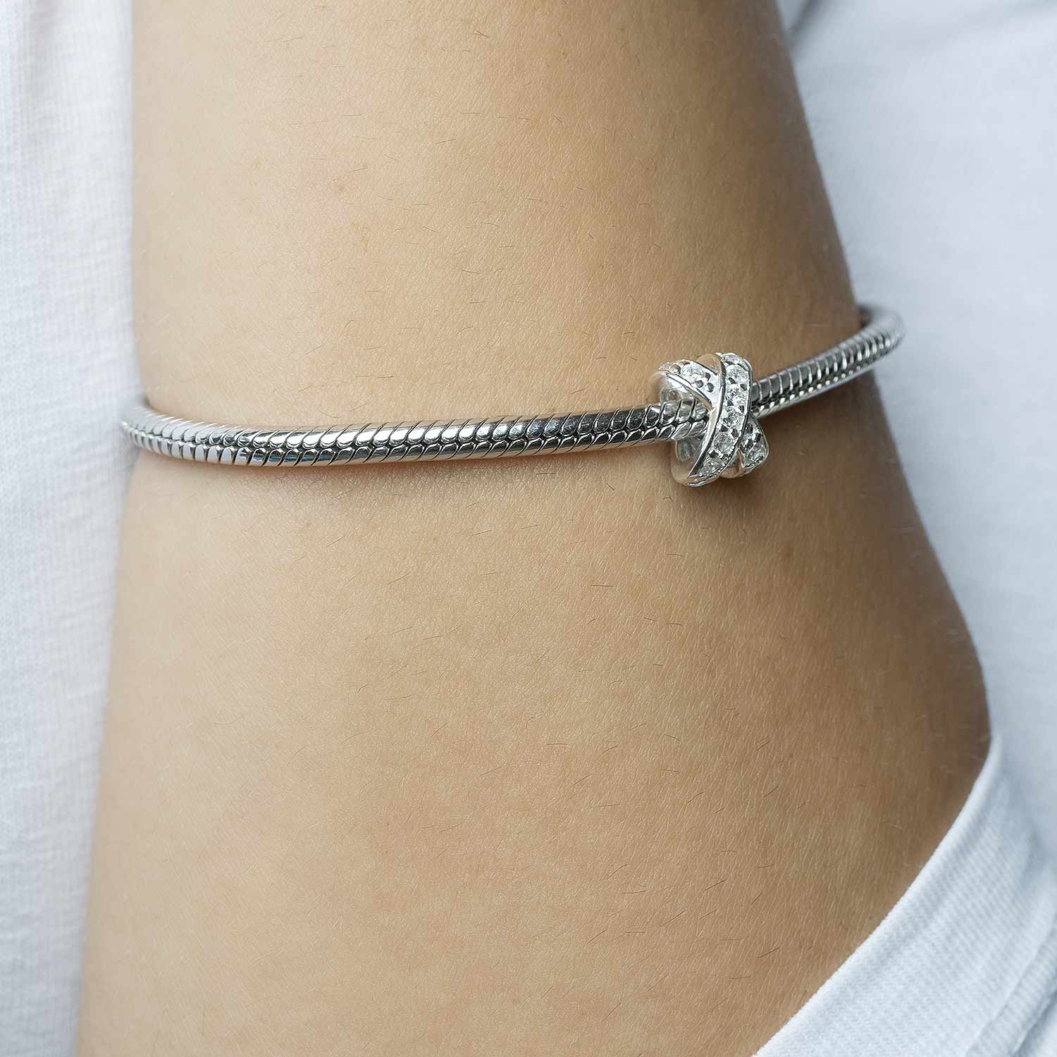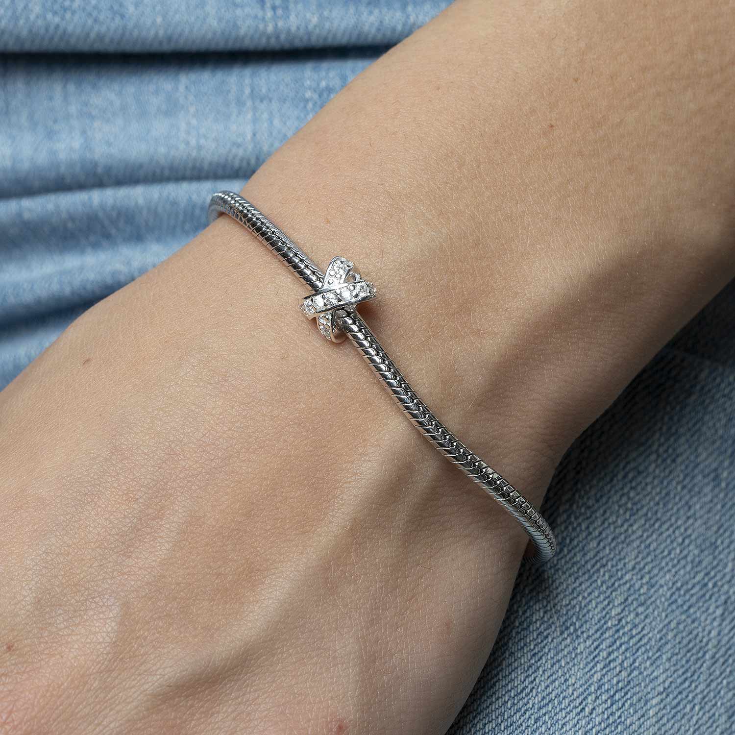 Dieser massiv gearbeitete Zirkonia Bead aus 925 Sterling Silber wurde mit 20 weißen Zirkonia Steinen besetzt. Das Beads Element ist in einer Knoten / Schleifen Optik gehalten und passt auf alle Beads Armbänder bis max. 4,4mm Breite/Dicke.