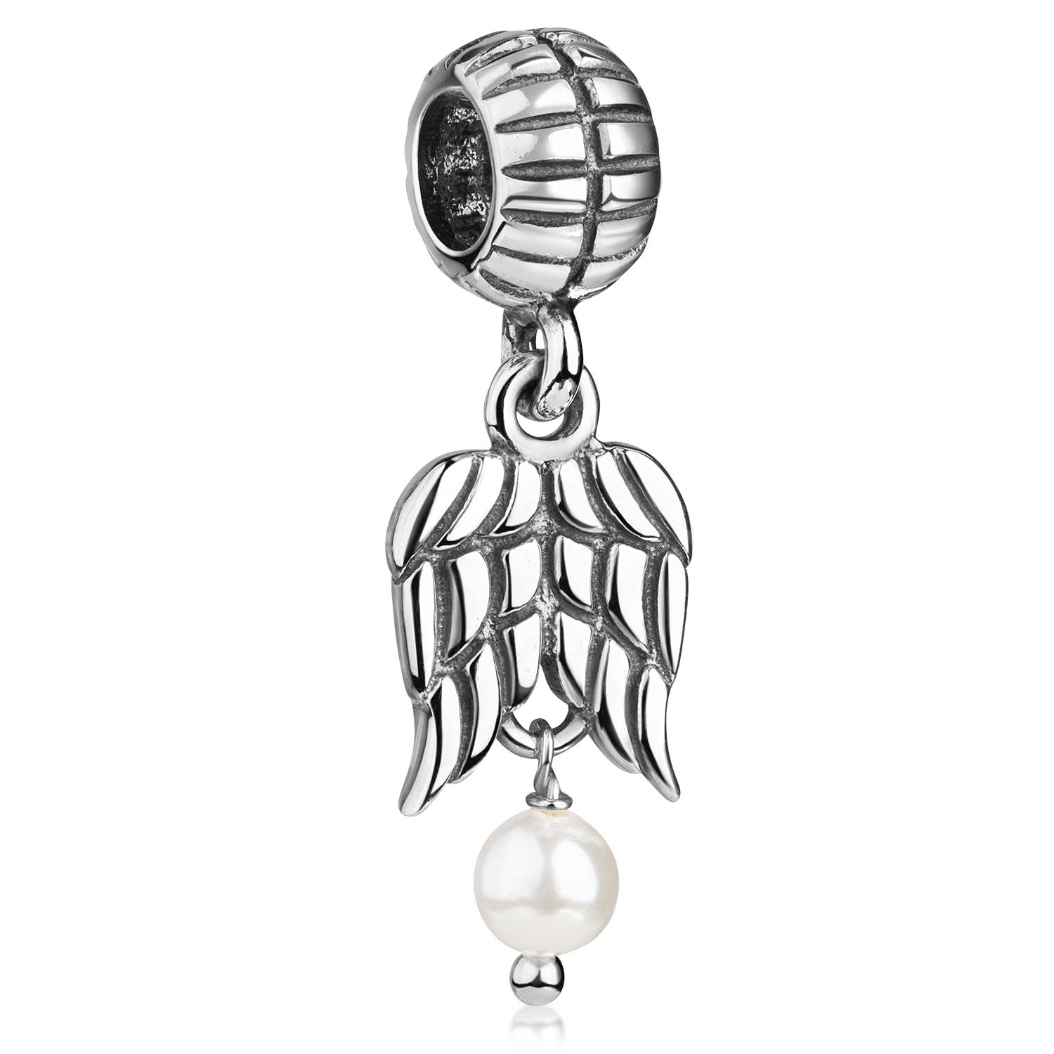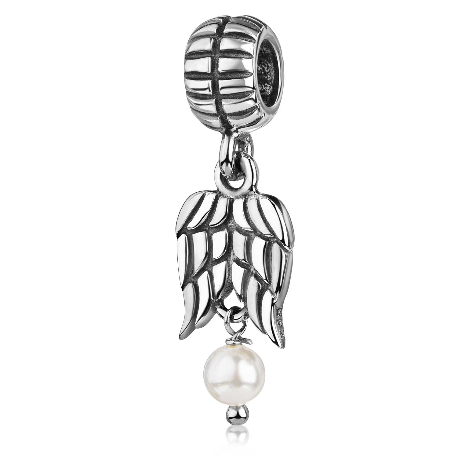 Dangle Bead Flügel / Engelsflügel Element mit 1 echten Süßwasser-Zuchtperle. Dieser Perlen Charm wurde aus 925 Sterling Silber gefertigt, welches durch die gewollte Oxidierung, seinen unverwechselbaren antiken Look erhält. Dieser Perlen Anhänger ist passend zu allen gängigen Bead Armbändern bis max. 4,4mm Stärke und somit kompatibel zu fast allen Beads Armbändern bekannter Marken / Herstellern.