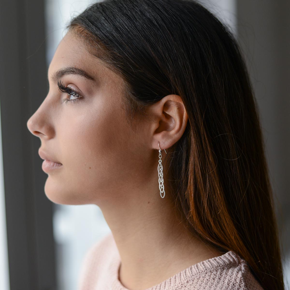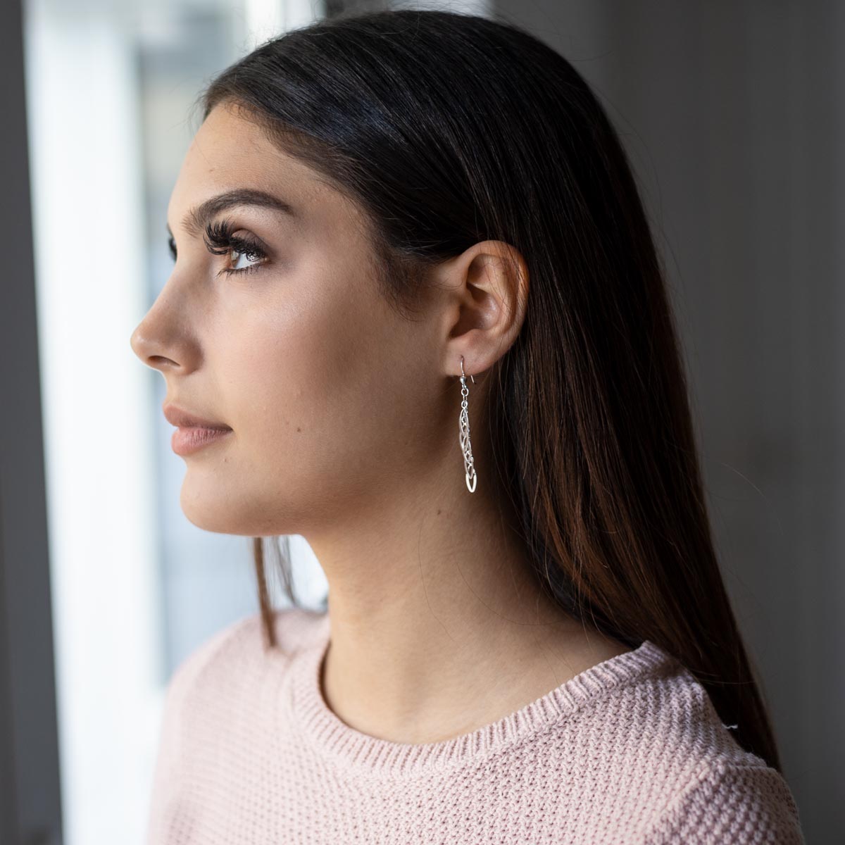 Diese Schmuck Ohrhänger im Tropfen Design wurden in Juwelierqualität aus massivem 925 Sterling Silber gearbeitet. Die Rückseite der Pendel Ohrringe wurde ebenfalls massiv gearbeitet und ist nicht hohl. Außerdem wurden die Ohrringe rhodiniert, wodurch sie gegen ein Anlaufen des Silbers geschützt sind. Diese filgranen Ohrhänger sind besondes elegant und edel gearbeitet und bestechen durch die einzelnen Tropfen-Elemente, welche allesamt freischwingend sind.