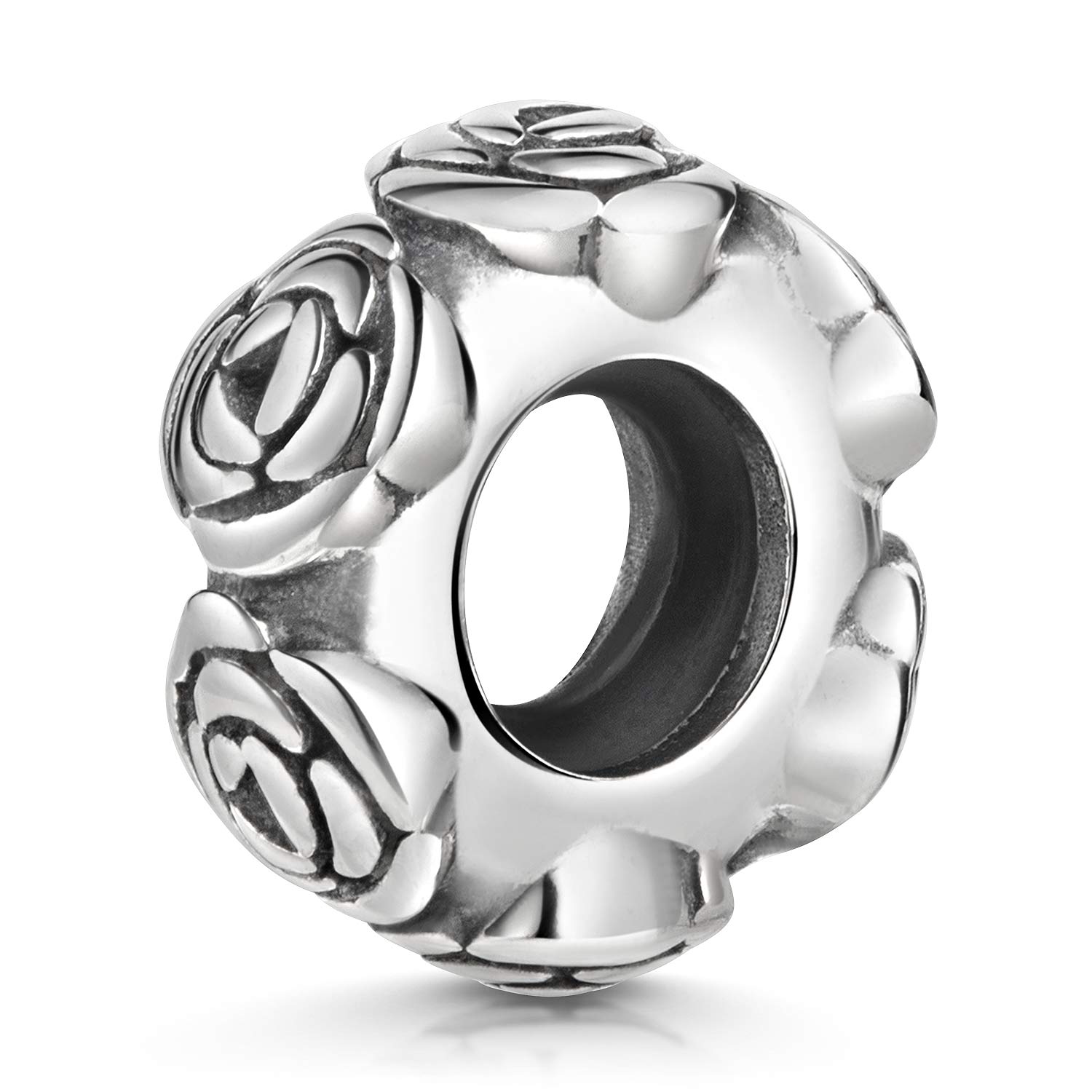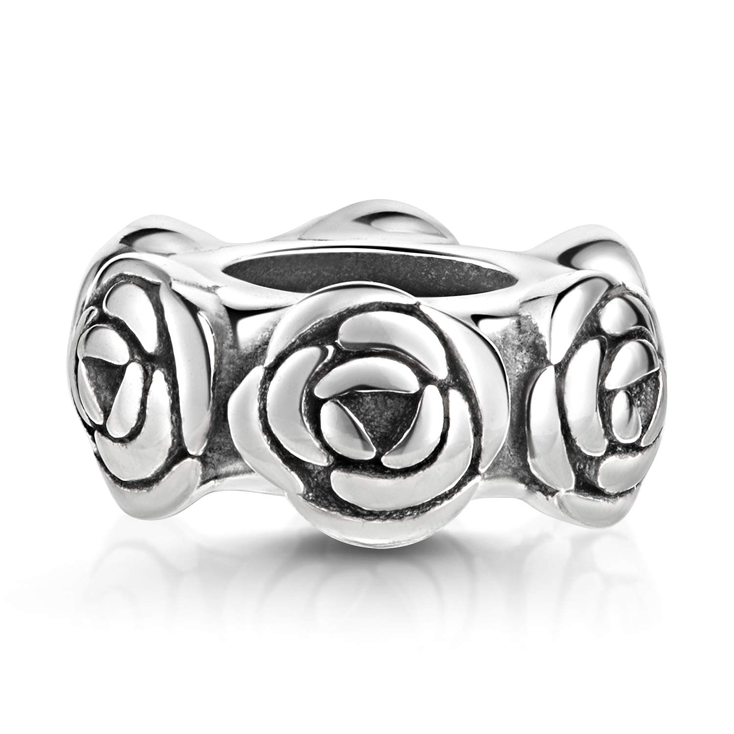 Stopper Bead mit Rosen-Motiven und Gummiring aus 925 Sterling Silber. Der Stopper passt auf alle Armbänder ohne Gewindebrücken mit einer max. Breite von 3mm.