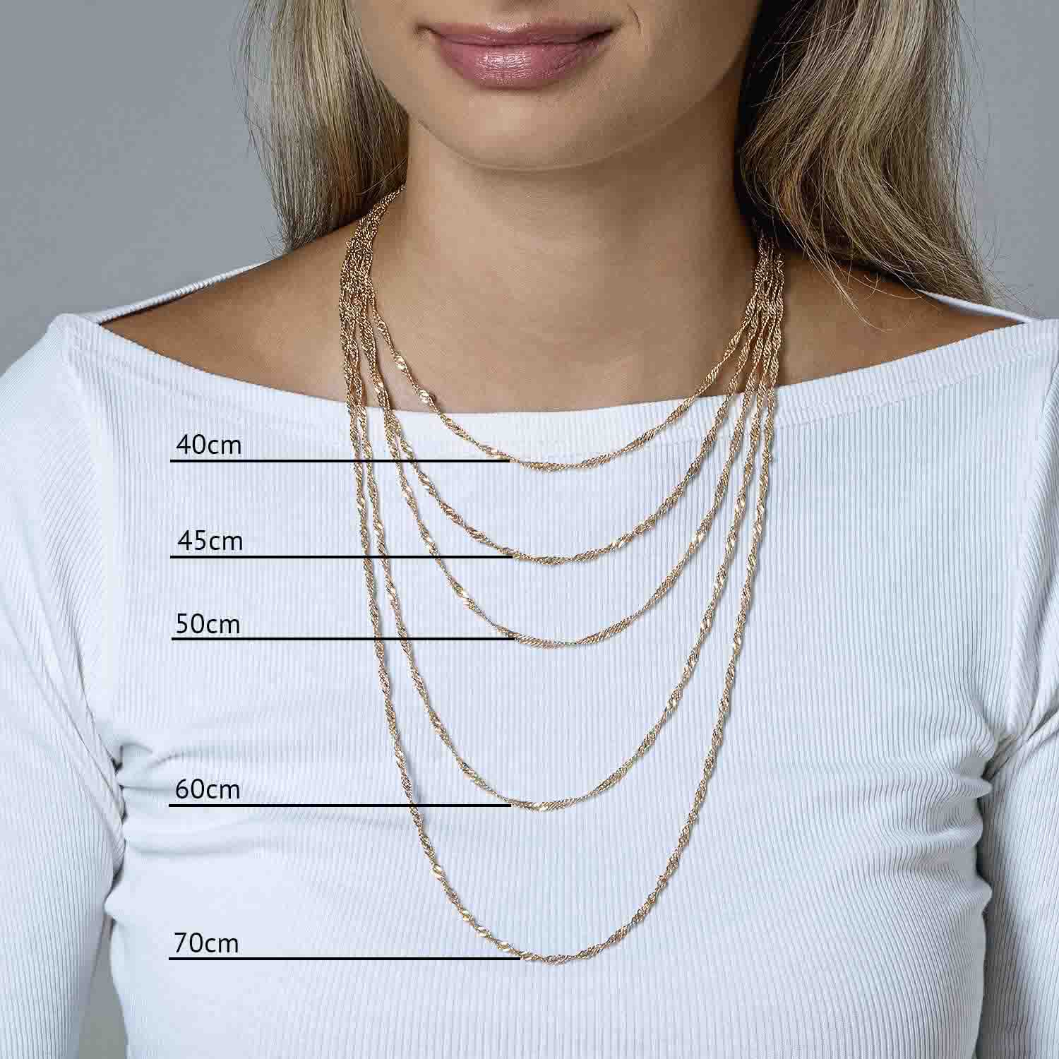 Die Singapurkette ist in verschiedenen Längen erhältlich: 40 cm, 45 cm, 50 cm, 60 cm und 70 cm, sodass Sie die perfekte Passform für Ihren individuellen Stil finden können. Mit einer Kettenstärke von 3 mm ist sie sowohl zart als auch robust, ideal für den täglichen Gebrauch. Das Gewicht variiert je nach Länge zwischen ca. 3,8 g und 7,6 g, was für ein angenehmes Tragegefühl sorgt.