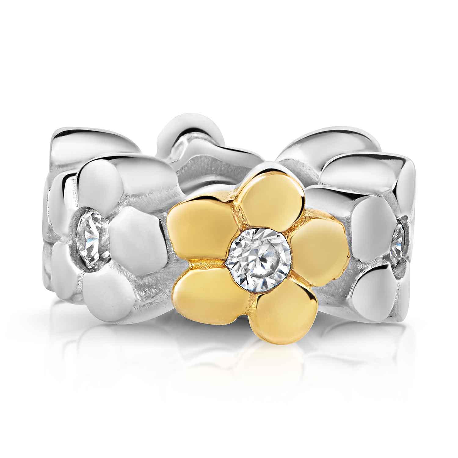 European Bead Spacer im Blumen Design aus 925 Sterling Silber mit Vergoldung und 5 gefassten weißen Zirkonia.