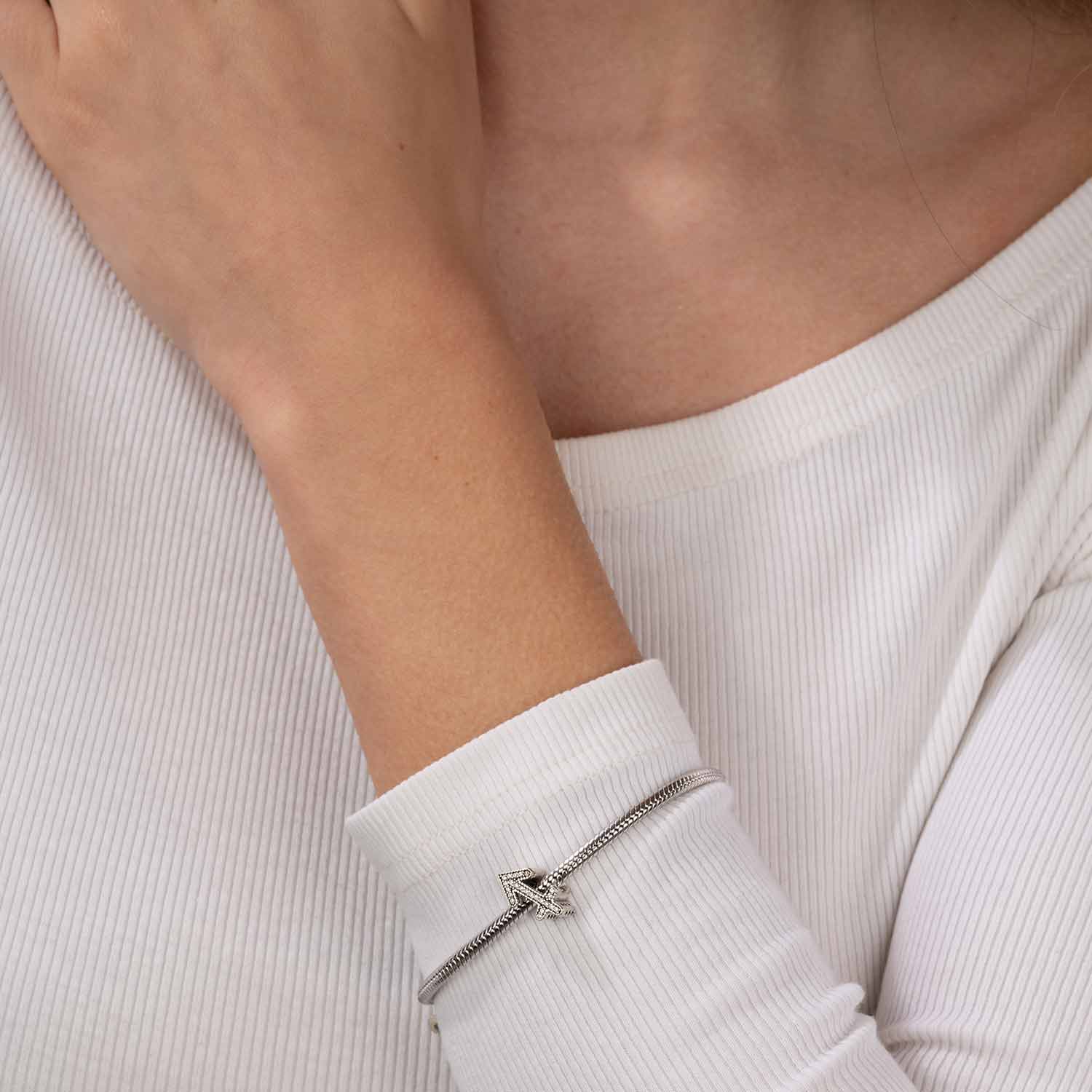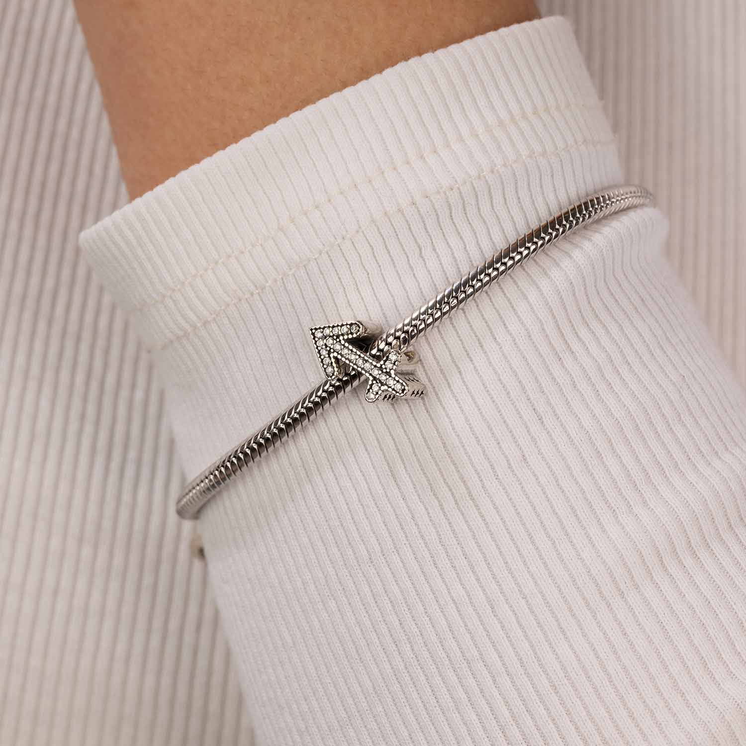 Funkelnder Charm mit dem Sternzeichen Schütze aus 925 Sterling Silber. Der Bead ist mit zahlreichen weißen Zirkonia verziert und eignet sich für alle Beads Armbänder und Ketten bis 4,4mm Stärke.