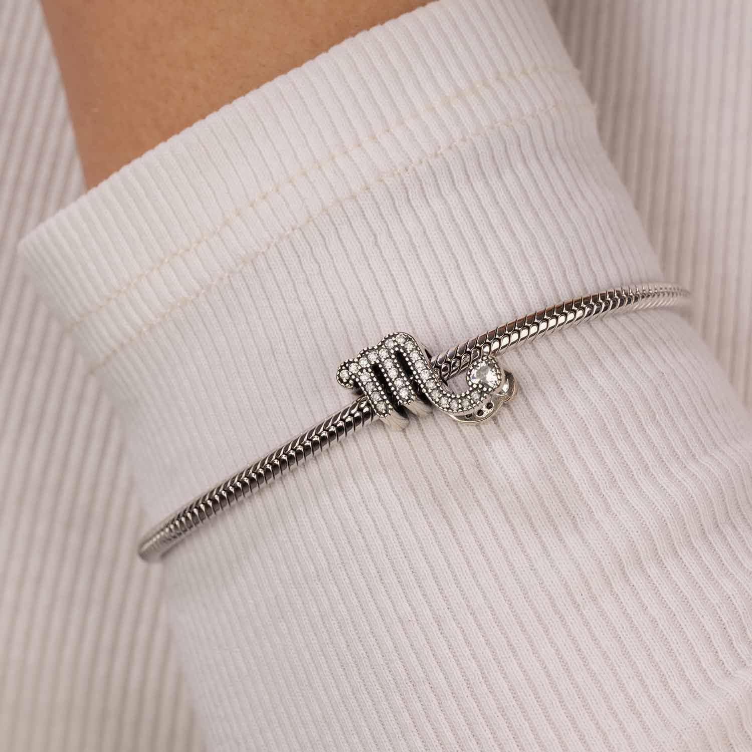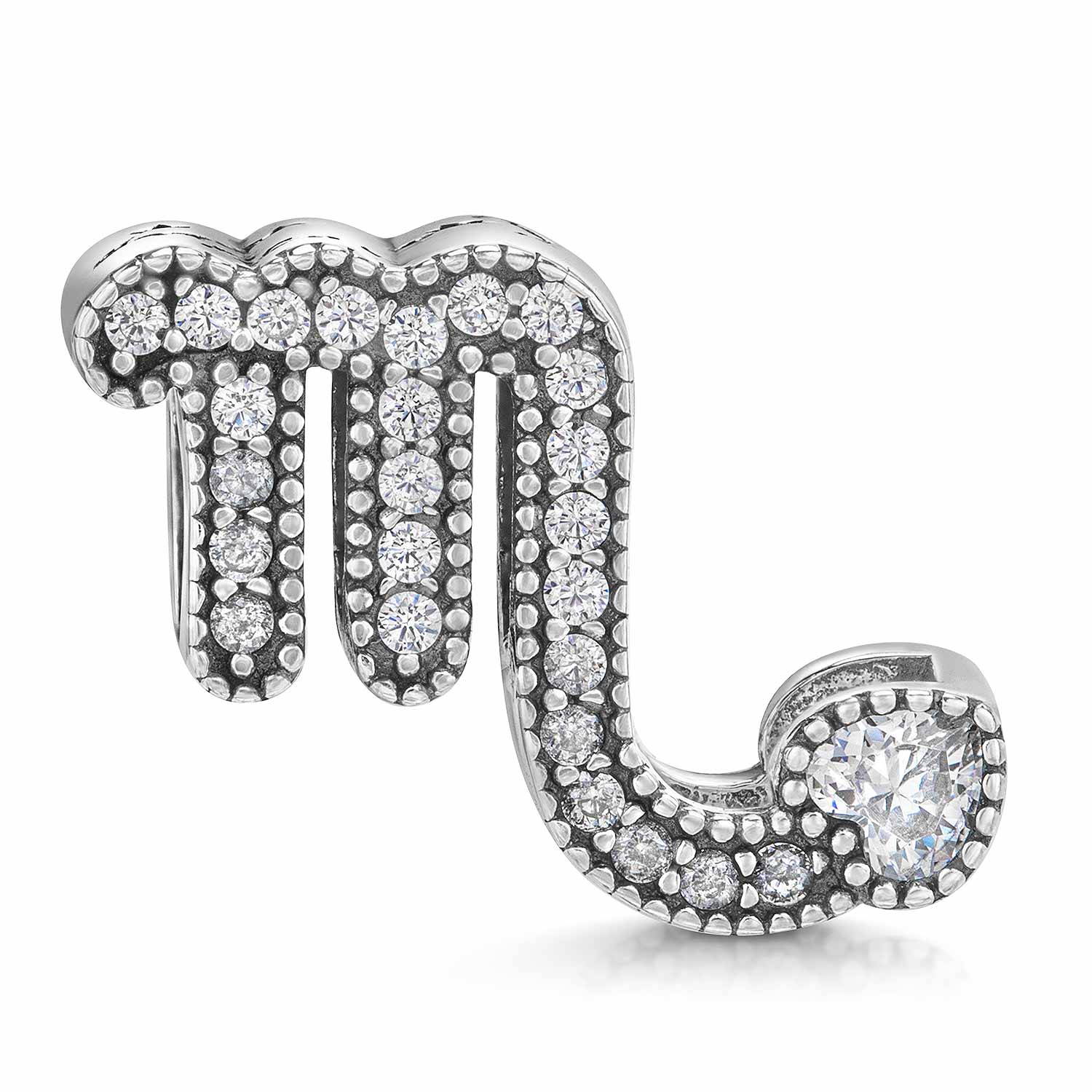 Funkelnder Charm mit dem Sternzeichen Skorpion aus 925 Sterling Silber. Der Bead ist mit zahlreichen weißen Zirkonia verziert und eignet sich für alle Beads Armbänder und Ketten bis 4,4mm Stärke.