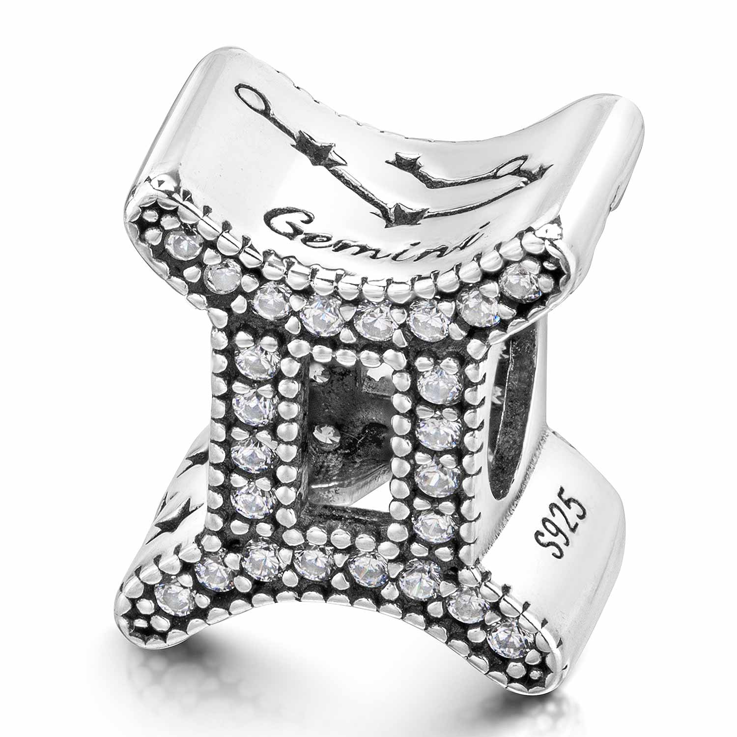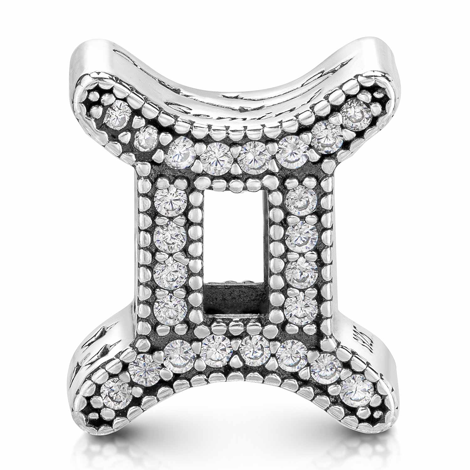 Funkelnder Charm mit dem Sternzeichen Zwillinge aus 925 Sterling Silber. Der Bead ist mit zahlreichen weißen Zirkonia verziert und eignet sich für alle Beads Armbänder und Ketten bis 4,4mm Stärke.
