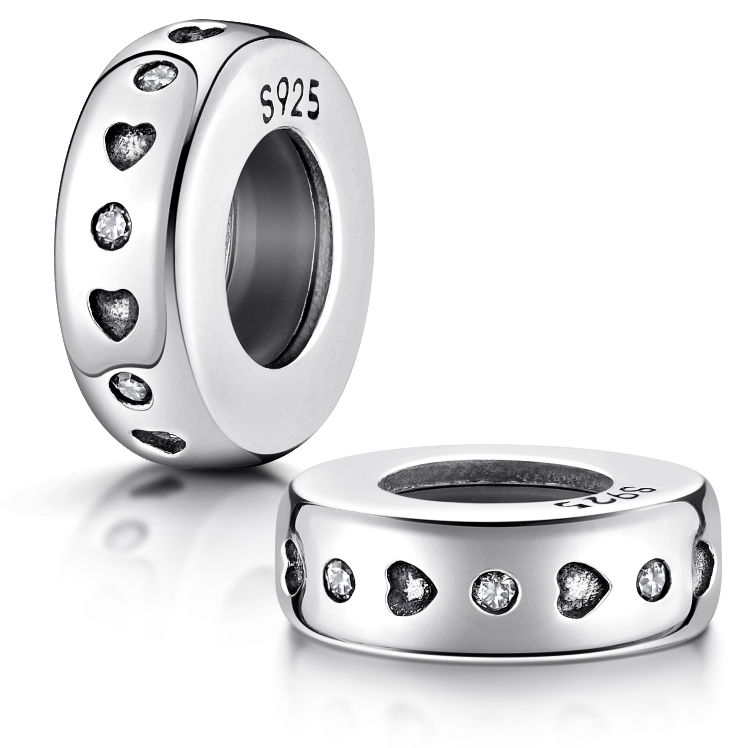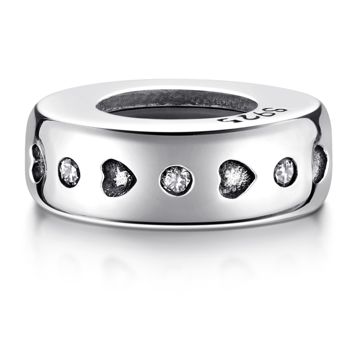 Stopper Bead mit ausgestanzten Herzen und Zirkonia Steinen aus 925 Sterling Silber. Auf der Innenseite ist er mit einem Gummiring versehen, welcher den Stopper an jeder Stelle des Armbandes festhält. Der Charm passt auf alle gängigen Armbänder und Halsketten mit 3mm Durchmesser.