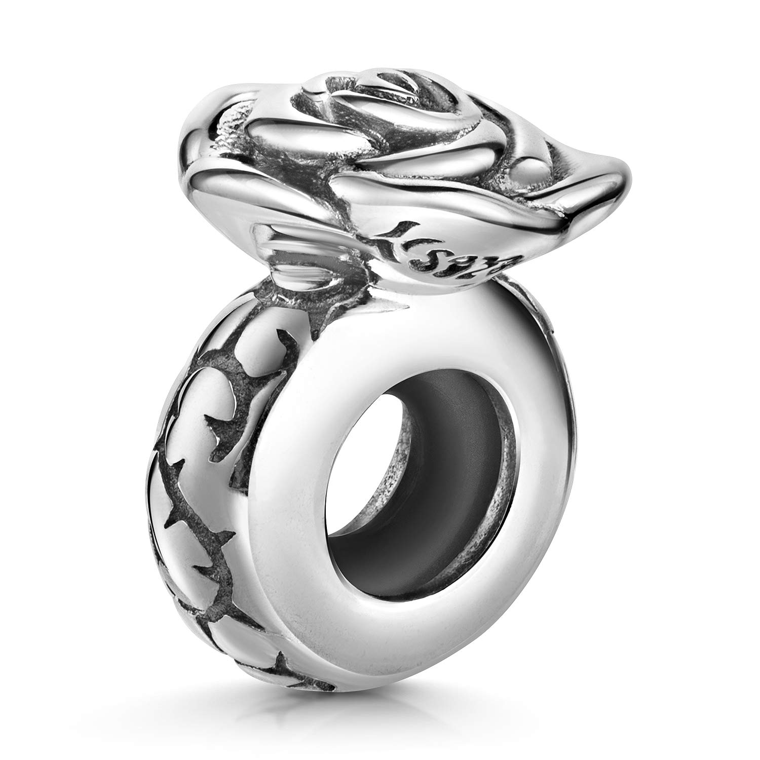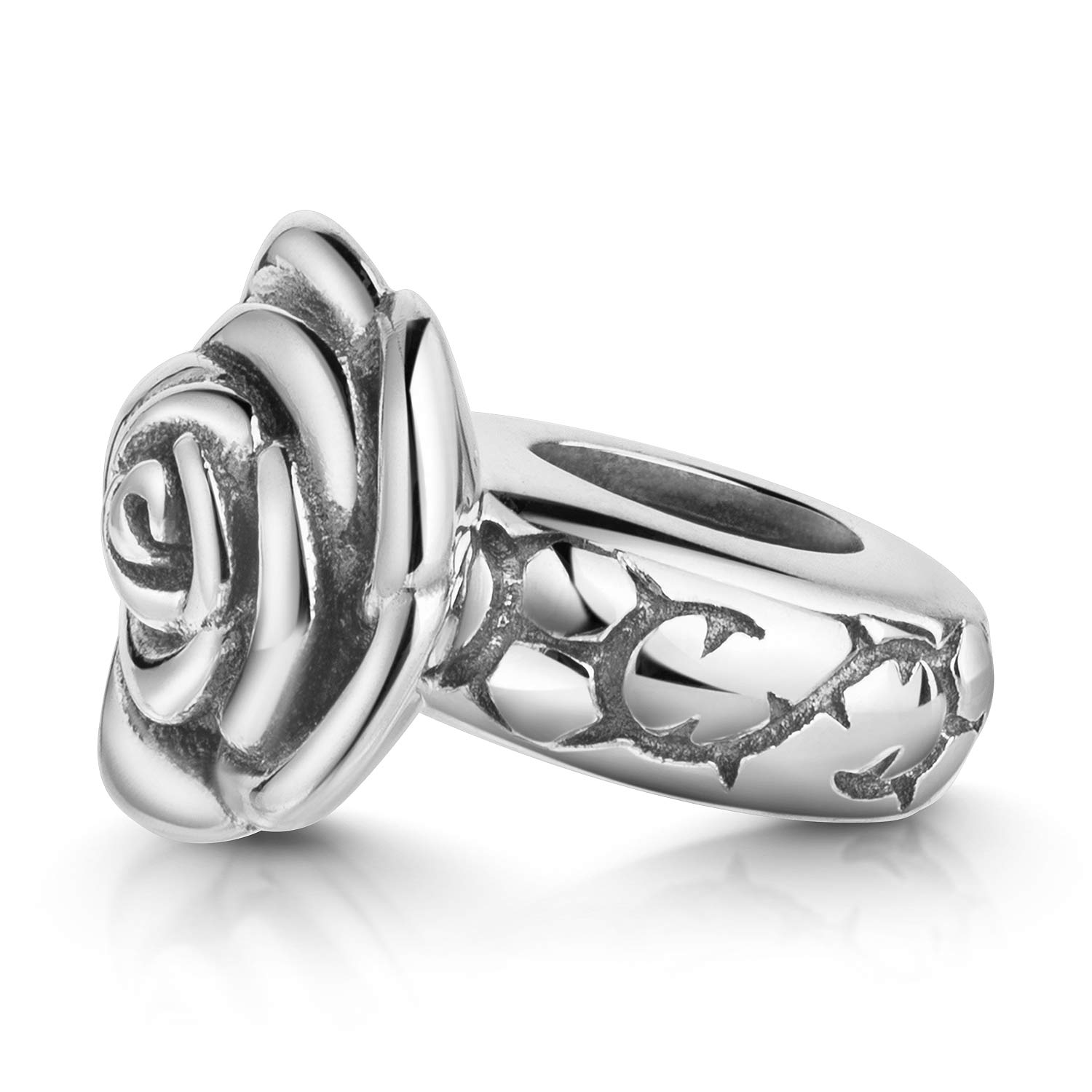 Stopper Charm mit einer Rose und Gummiring aus 925 Sterling Silber. Der Stopper Bead passt auf alle Armbänder ohne Gewindebrücken mit einer max. Breite von 3mm.