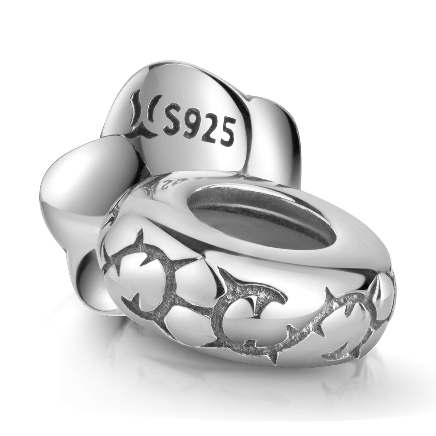 Hergestellt aus 925 Sterling Silber, ist dieser Bead Stopper nicht nur langlebig, sondern auch von hoher Qualität. Der Stempel auf dem Metall bezeugt die Echtheit und Reinheit des Silbers. Die Oberfläche des 925 Silber Beads ist geschwärzt und oxidiert, was dem Schmuckstück eine elegante und antike Ausstrahlung verleiht. Diese besondere Oberflächenbehandlung hebt das Rosendesign und die filigranen Ranken hervor und sorgt dafür, dass der Stopper Charm in jeder Lichtquelle glänzt.