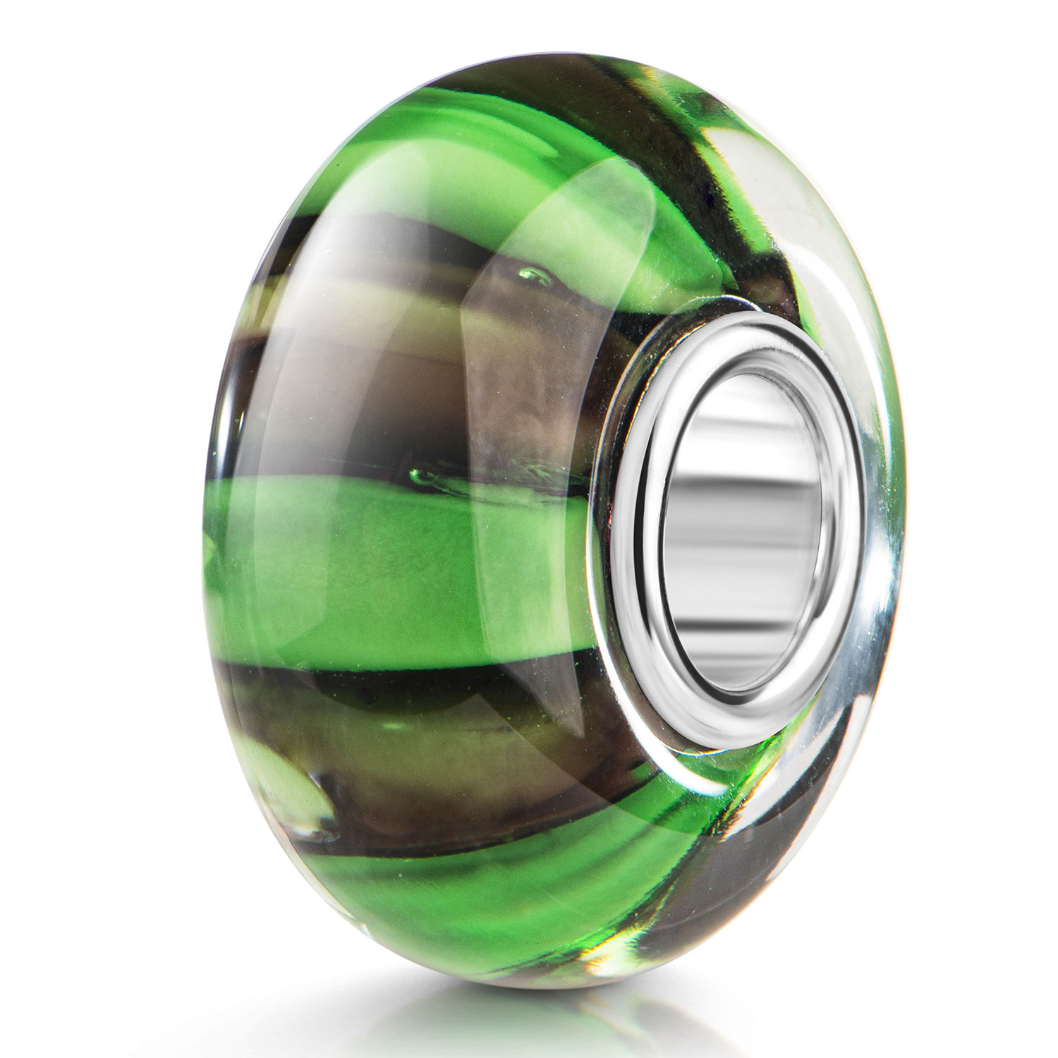 Glas Bead Element mit grünen und braunen Streifen sowie einer 925er Silber Hülse. Die Glasperle ist passend zu allen gängigen Schmuck Bead-Armbändern & Ketten anderer großer Marken bis max. 4,4mm Lochdurchmesser.