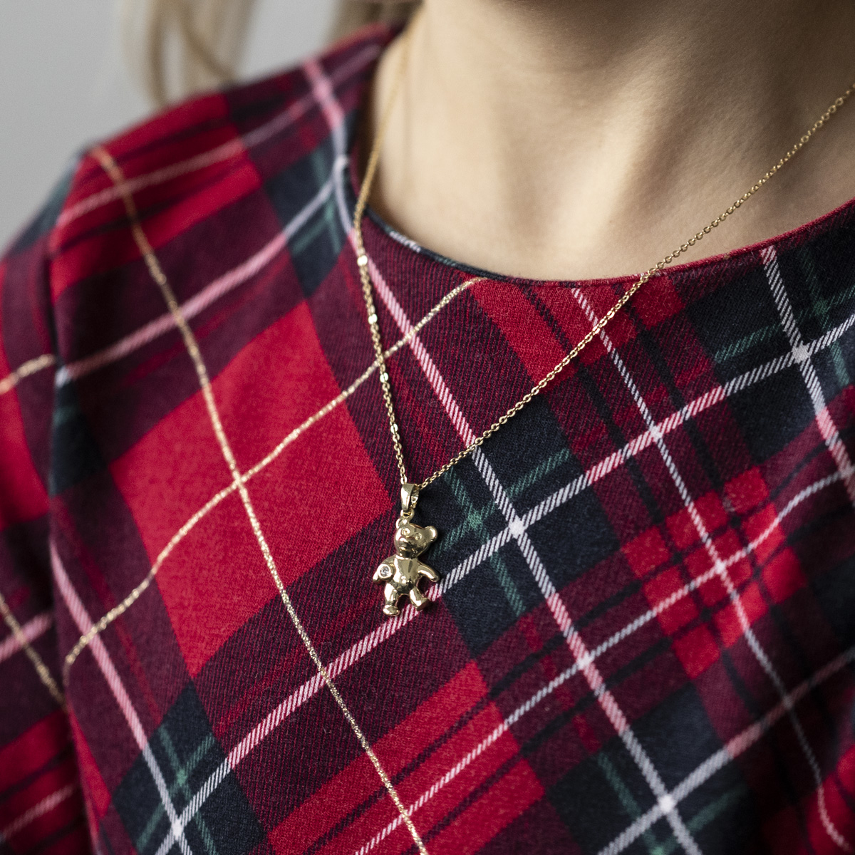 Niedlicher Kinder Anhänger in Form eines Teddybären wurde aus 925 Sterling Silber angefertigt und anschließend vergoldet. Er überrascht mit einem funkelnden weißen Zirkonia im Brillant-Schliff. Der Anhänger ist grundsätzlich passend für Ketten bis zu einer max. Stärke von 2,5mm.