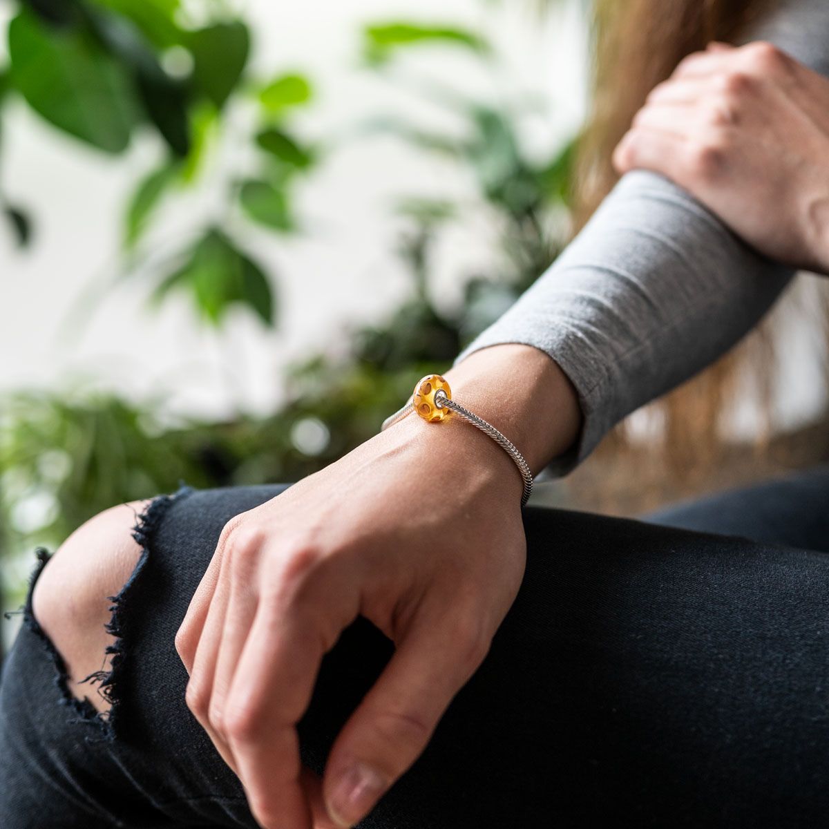 Trendiger Glas Bead mit 925 Silber Hülse in toffeebraunem Farbton. Dank seinem außergewöhnlichen Design wird der Bead zum Blickfang an Ihrem Armband oder Kette. Er kann an alle handelsüblichen Beads Armbänder und Ketten bis max. 4,4mm Breite aufgefädelt werden und ist für Beads Armbänder und Ketten aller großen Marken geeignet.