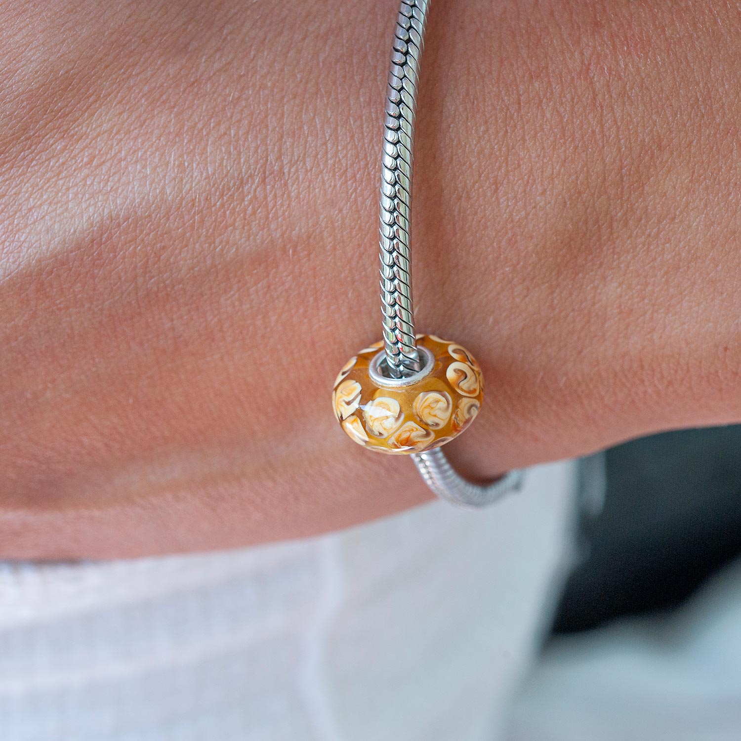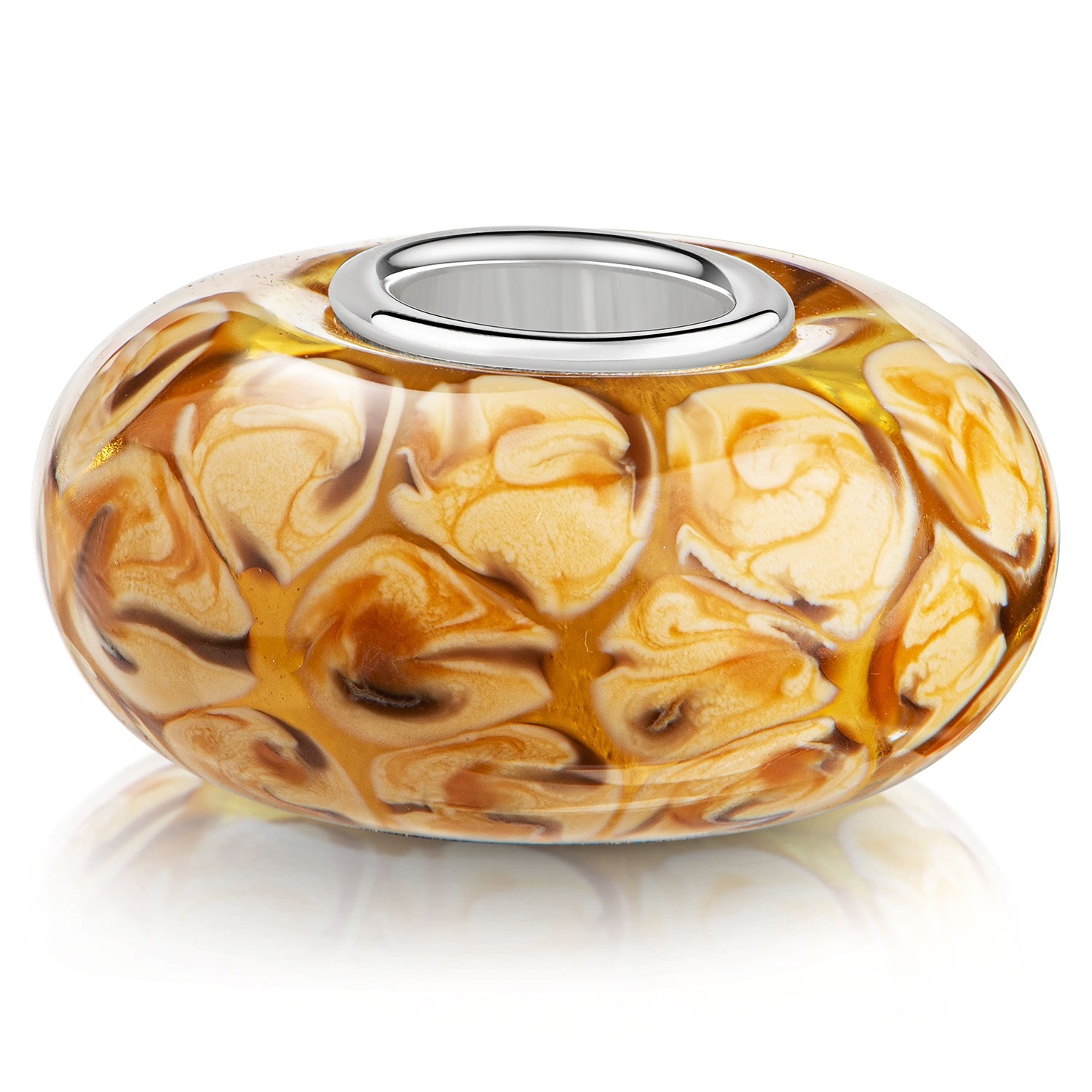 Bead aus Glas in Braun und Karamell Tönen mit einer Hülse aus 925 Silber. Der Bead passt auf Armbänder und Ketten aller handelsüblichen Beads Marken bis 4,4mm Stärke.