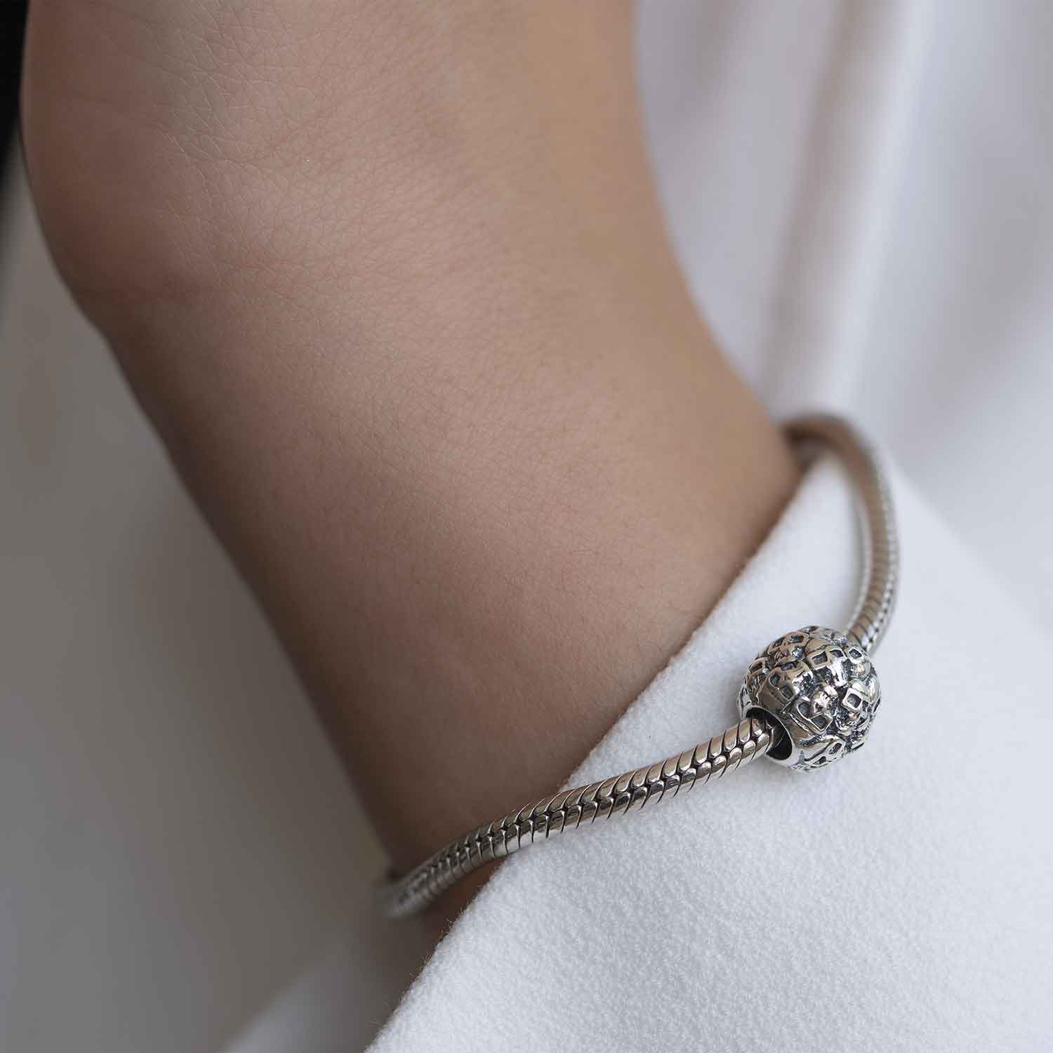 Unser Bead ist mit zahlreichen Totenköpfen versehen und wurde aus 925 Sterling Silber gefertigt. Der Bead ist teilweise geschwärzt und ist passend zu allen gängigen Bead Armbändern bis max. 4,2mm Stärke.