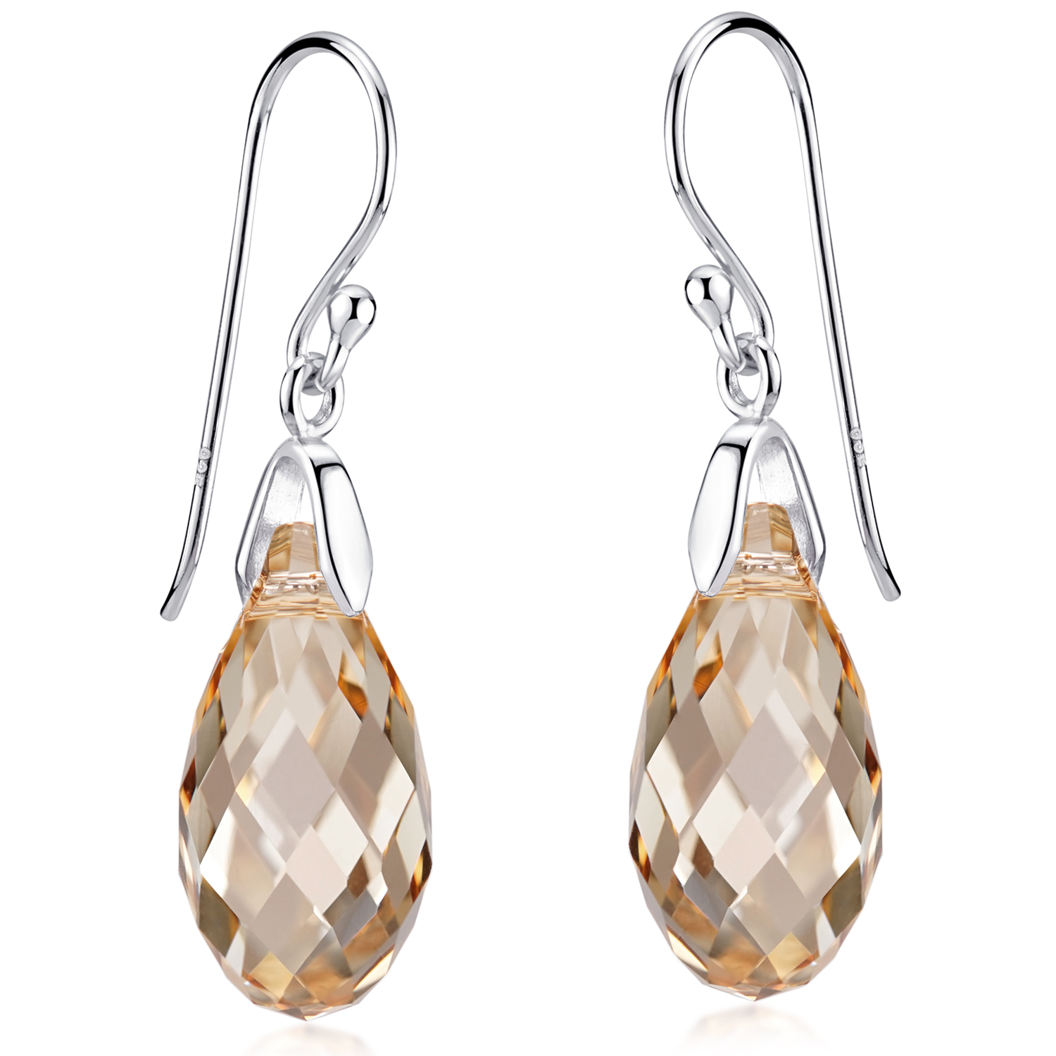 Unsere Tropfen Ohrhänger in dreidimensionaler Optik wurden aus 925 Sterling Silber gearbeitet und mit facettierten Kristallen ausgestattet. Die Steine sind im Briolett-Schliff gehalten. Die Facetten funkeln in einem warmen Apricot-Farbton. Die Kristall Ohrringe sind durch den besonderen Schliff stilvoll und funkeln facettenreich im Licht.